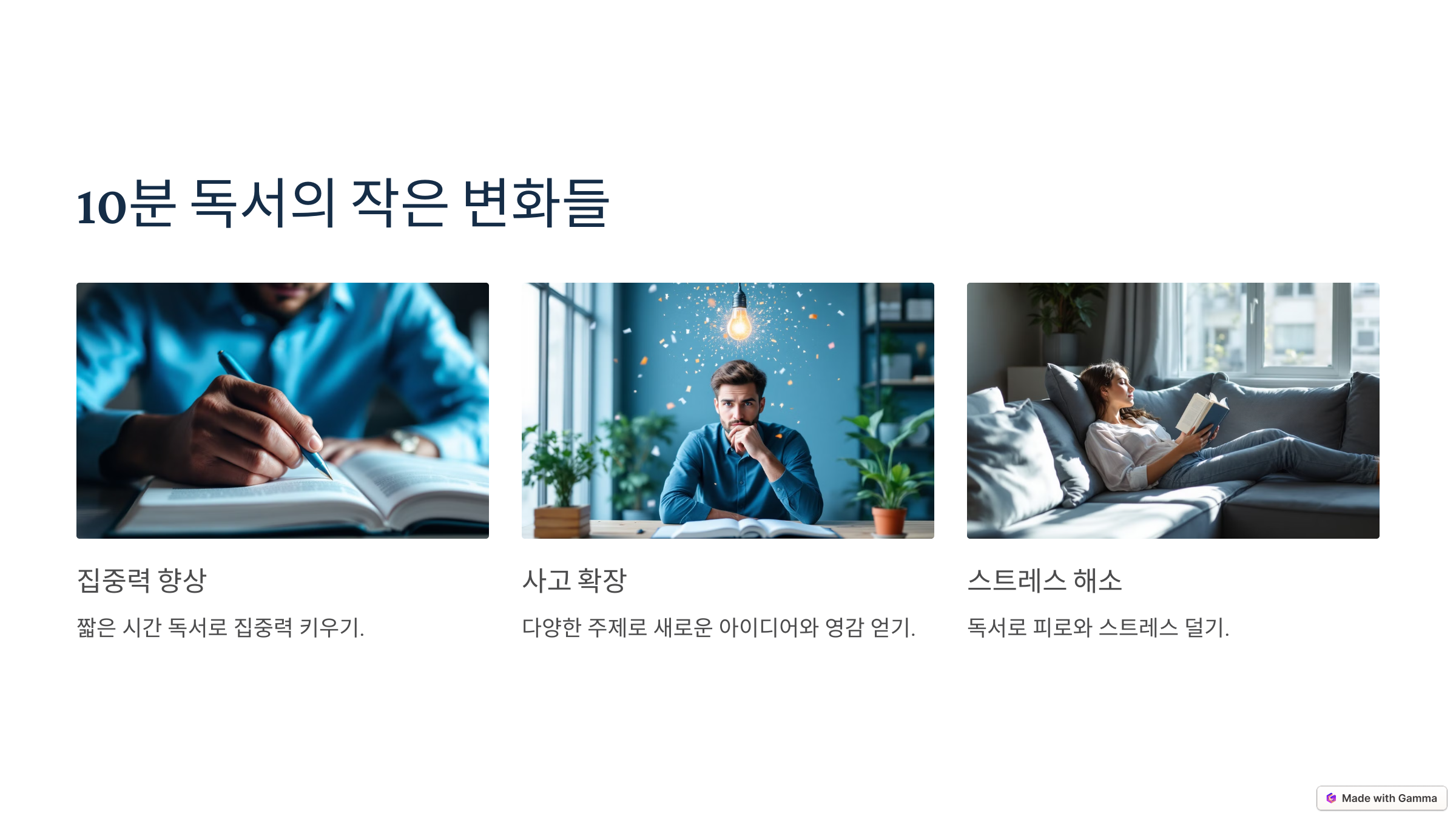 - 집중력 향상: 짧은 시간이기 때문에 부담이 적어 더 쉽게 집중할 수 있습니다. 집중력 향상은 차츰 더 긴 독서로도 이어질 수 있습니다.