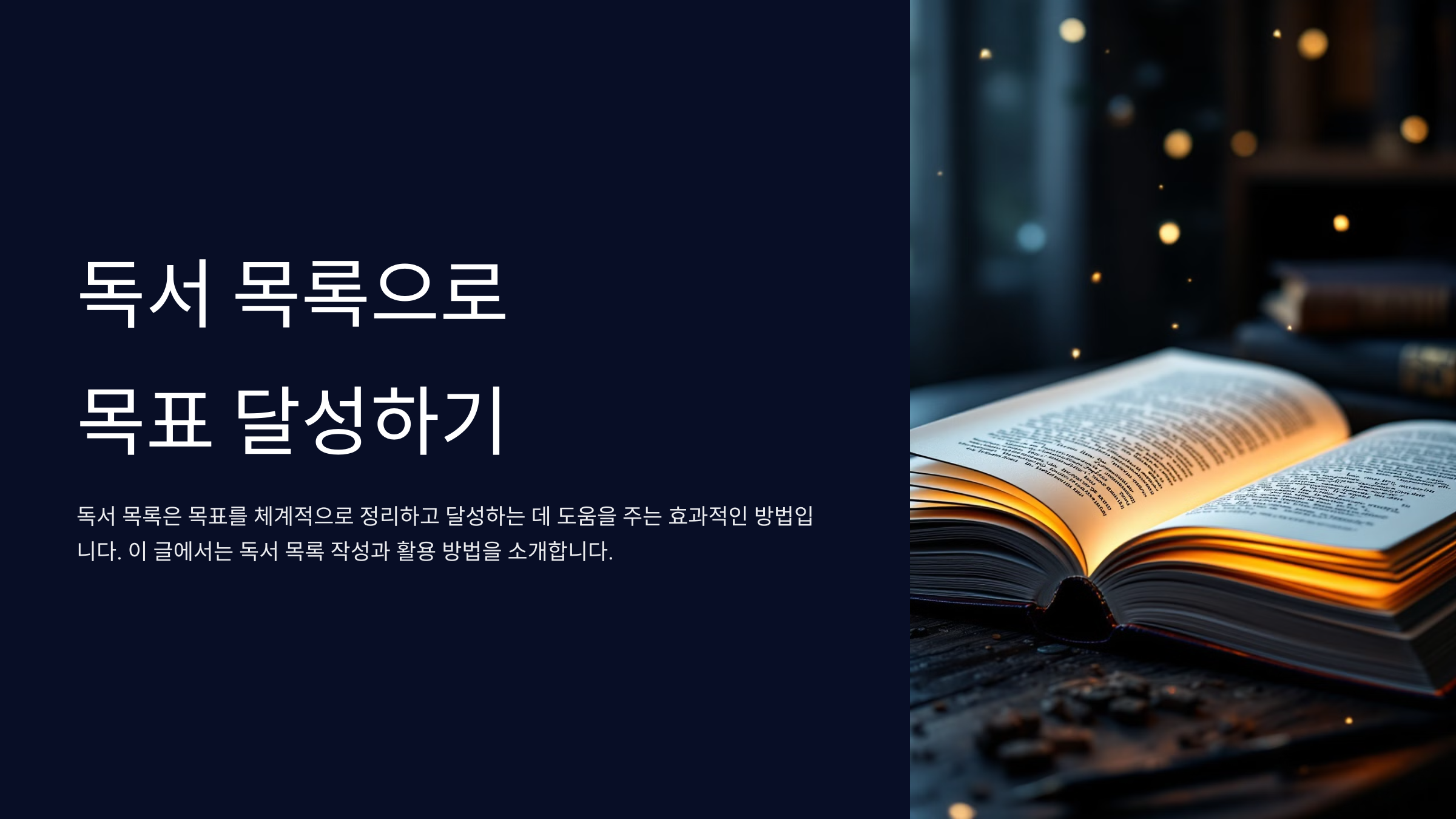 독서 목록은 단순히 책을 나열하는 것을 넘어, 목표를 세우고 실천할 수 있도록 돕는 강력한 도구입니다. 목록을 체계적으로 구성하고, 이를 바탕으로 꾸준히 실천한다면 연말에는 자신이 설정한 독서 목표를 완벽히 달성할 수 있을 것입니다. 지금 바로 읽고 싶은 책을 목록으로 정리하고, 첫 번째 책부터 시작해보세요!