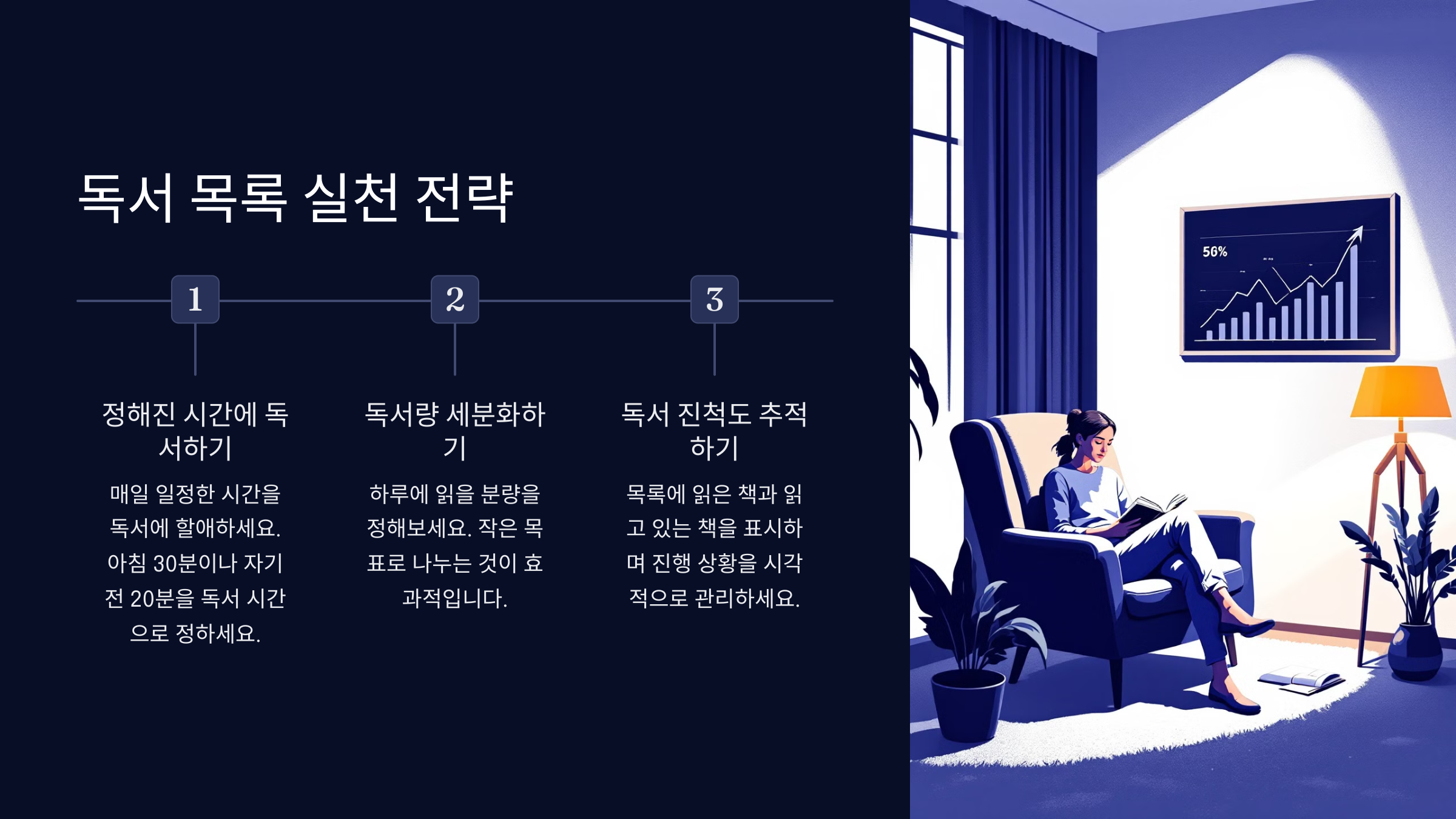 매일 일정한 시간을 독서에 할애하세요. 예를 들어, 아침 30분이나 자기 전 20분을 독서 시간으로 정하면 꾸준히 책을 읽을 수 있습니다. - 독서량을 세분화하기