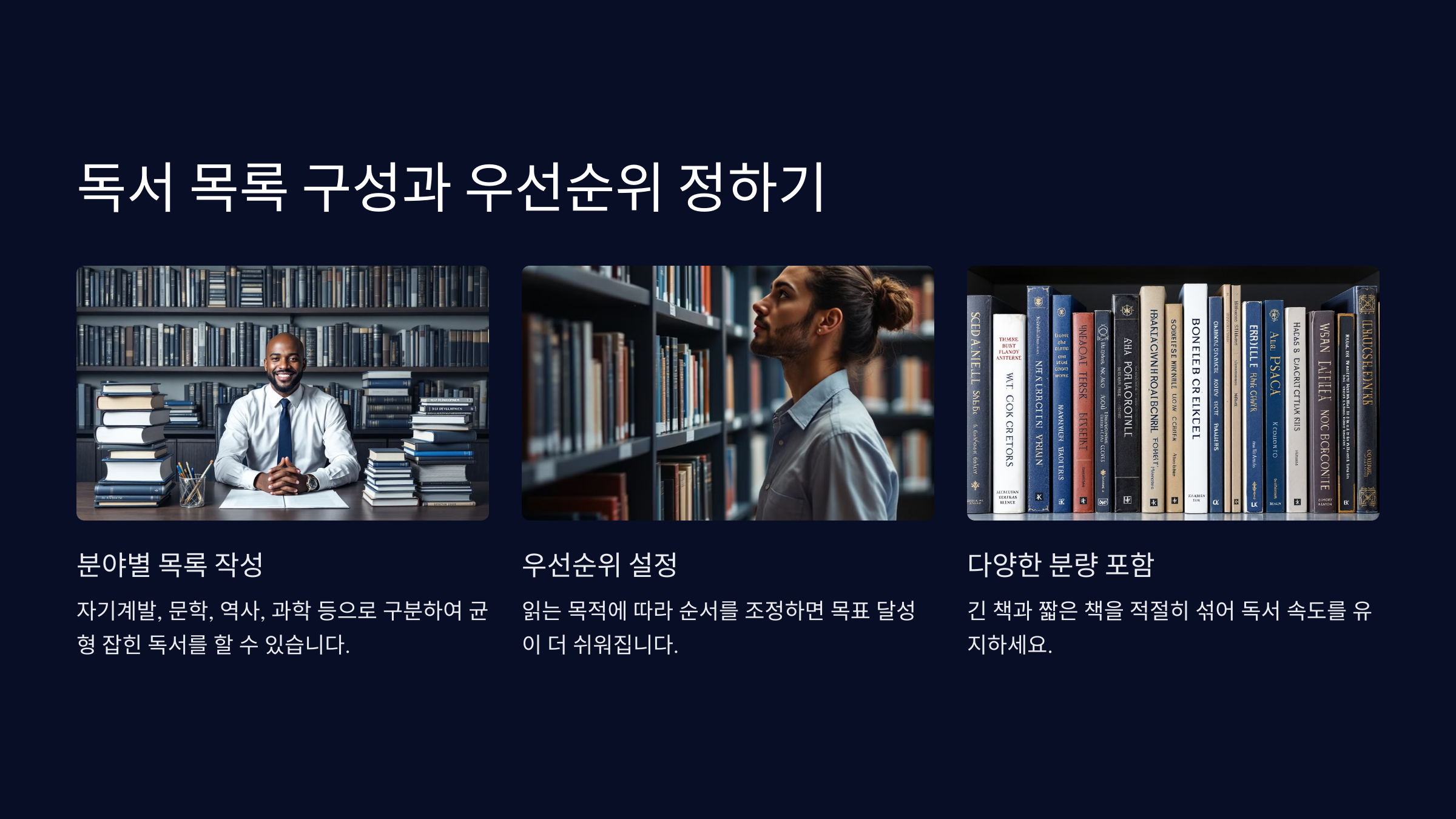 책의 길이나 난이도를 고려해 목표를 세분화하세요. 예를 들어, 두꺼운 책은 한 달에 한 권, 얇은 책은 한 주에 한 권 읽는 식으로 나눠보세요.