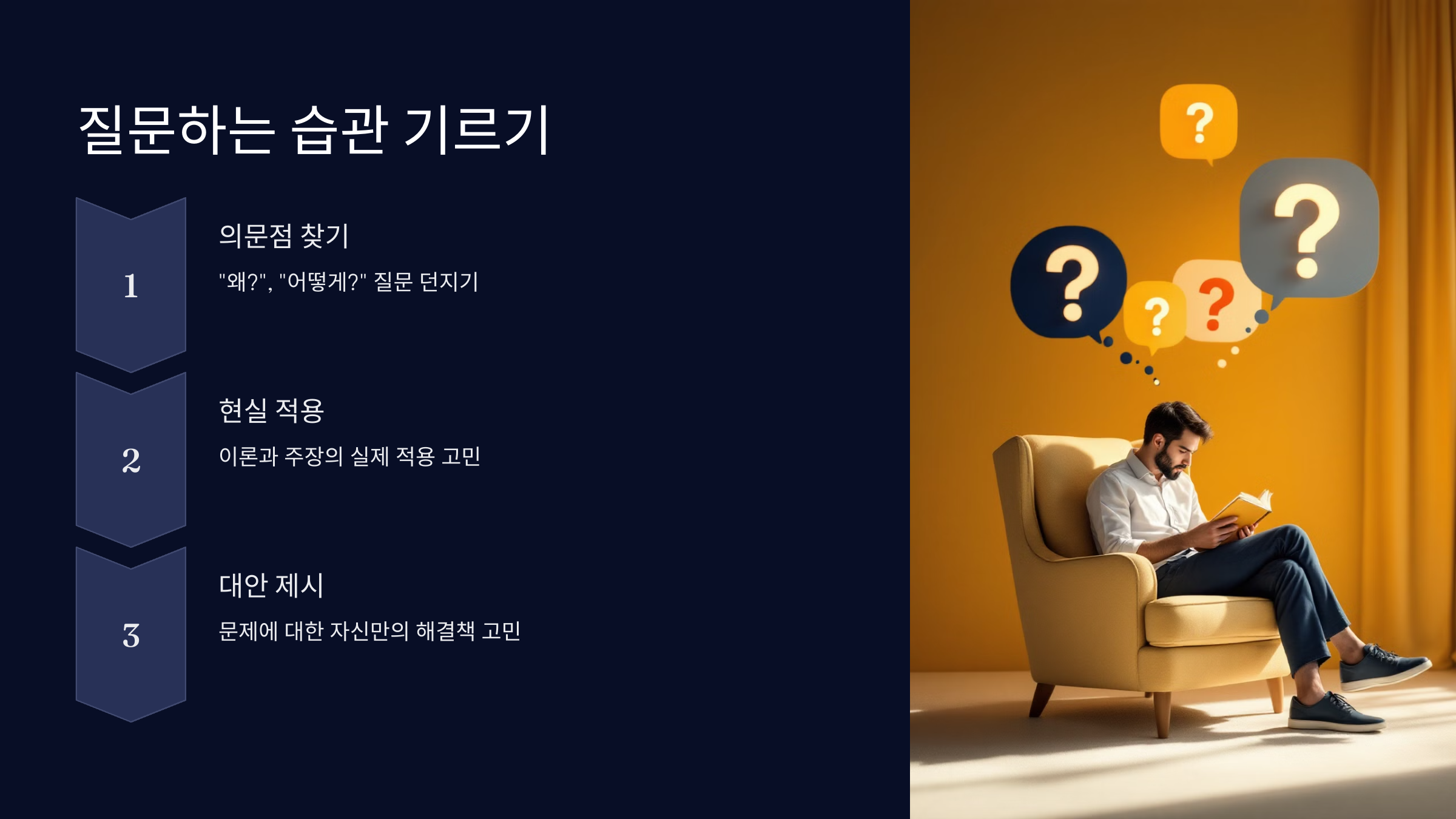 독서를 단순히 읽는 데 그치지 않고, 책을 읽으며 질문하는 습관을 들이면 사고력이 향상됩니다.