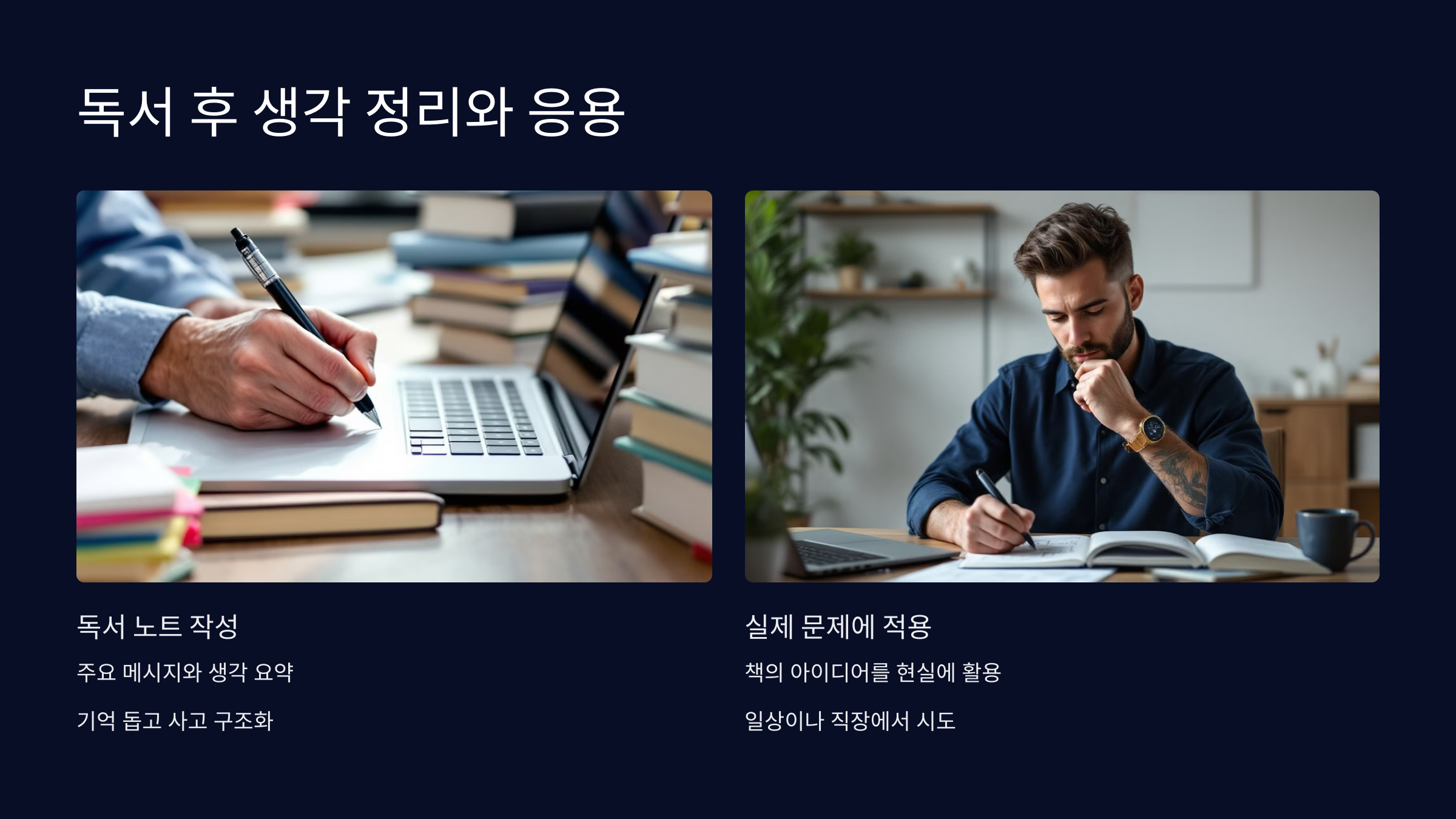 책의 주요 메시지와 자신의 생각을 요약하며 정리하세요. 독서 노트는 기억을 돕고, 사고를 구조화하는 데 유용한 도구입니다. - 책의 아이디어를 실제 문제에 적용하기