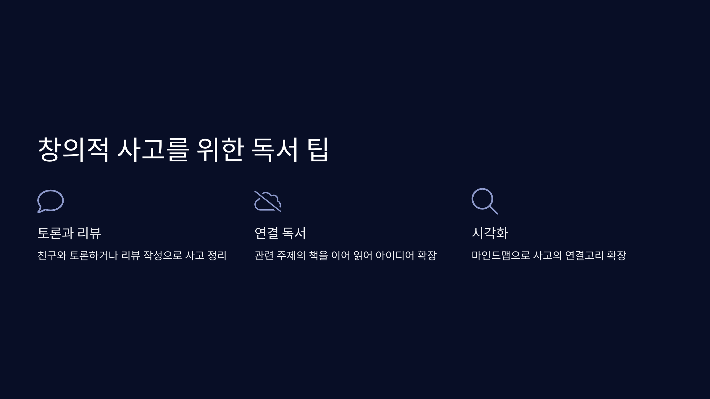 읽은 책의 내용을 친구와 토론하거나 리뷰를 작성하면 사고를 정리하고 새로운 관점을 얻는 데 도움이 됩니다. - 연결 독서 시도하기