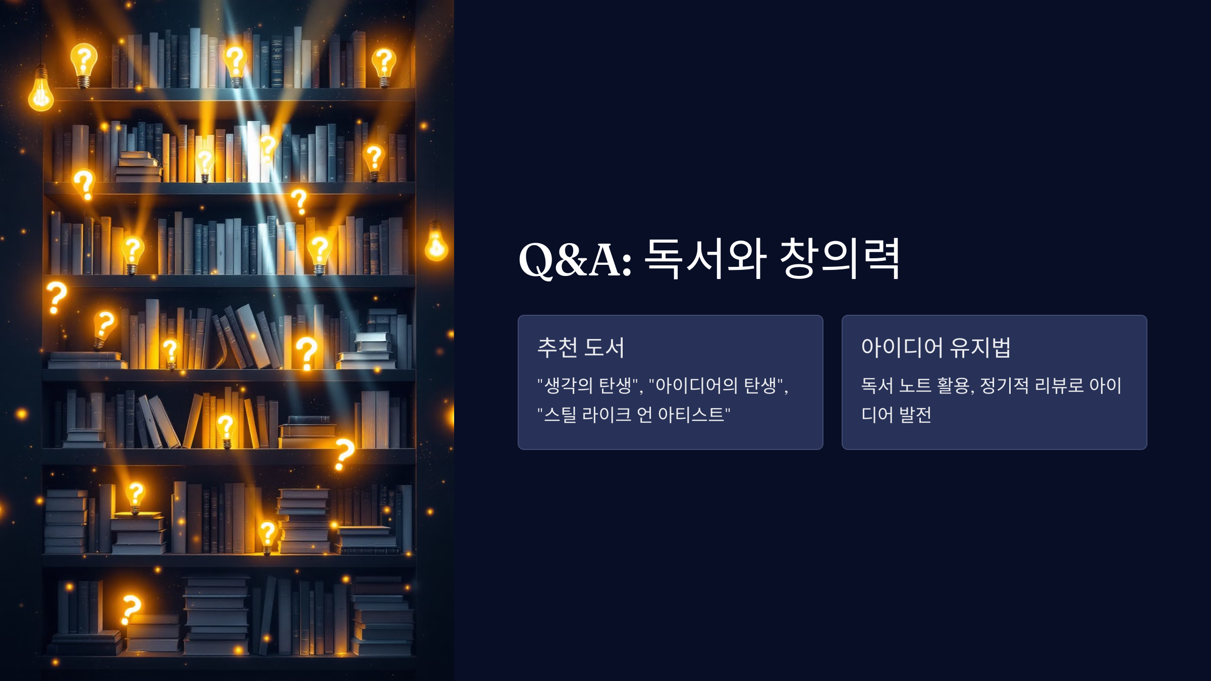 A2. 독서 노트를 활용해 아이디어를 기록하고, 이를 정기적으로 리뷰하면서 발전시키는 것이 효과적입니다.