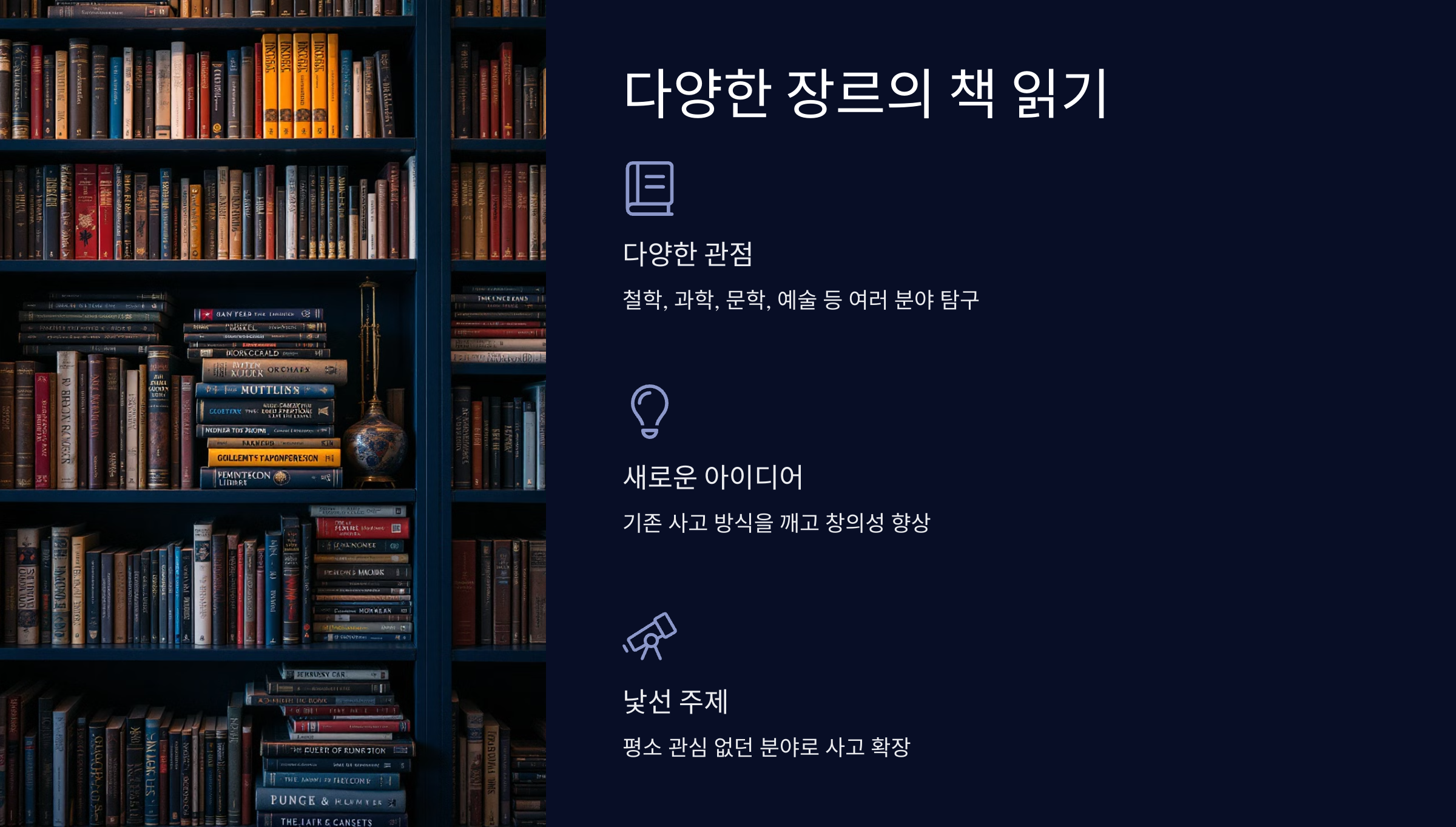 창의적인 사고는 다양한 지식과 경험에서 비롯됩니다. 특정 분야에 국한되지 않고 다양한 장르의 책을 읽는 것은 사고력을 높이는 첫걸음입니다.