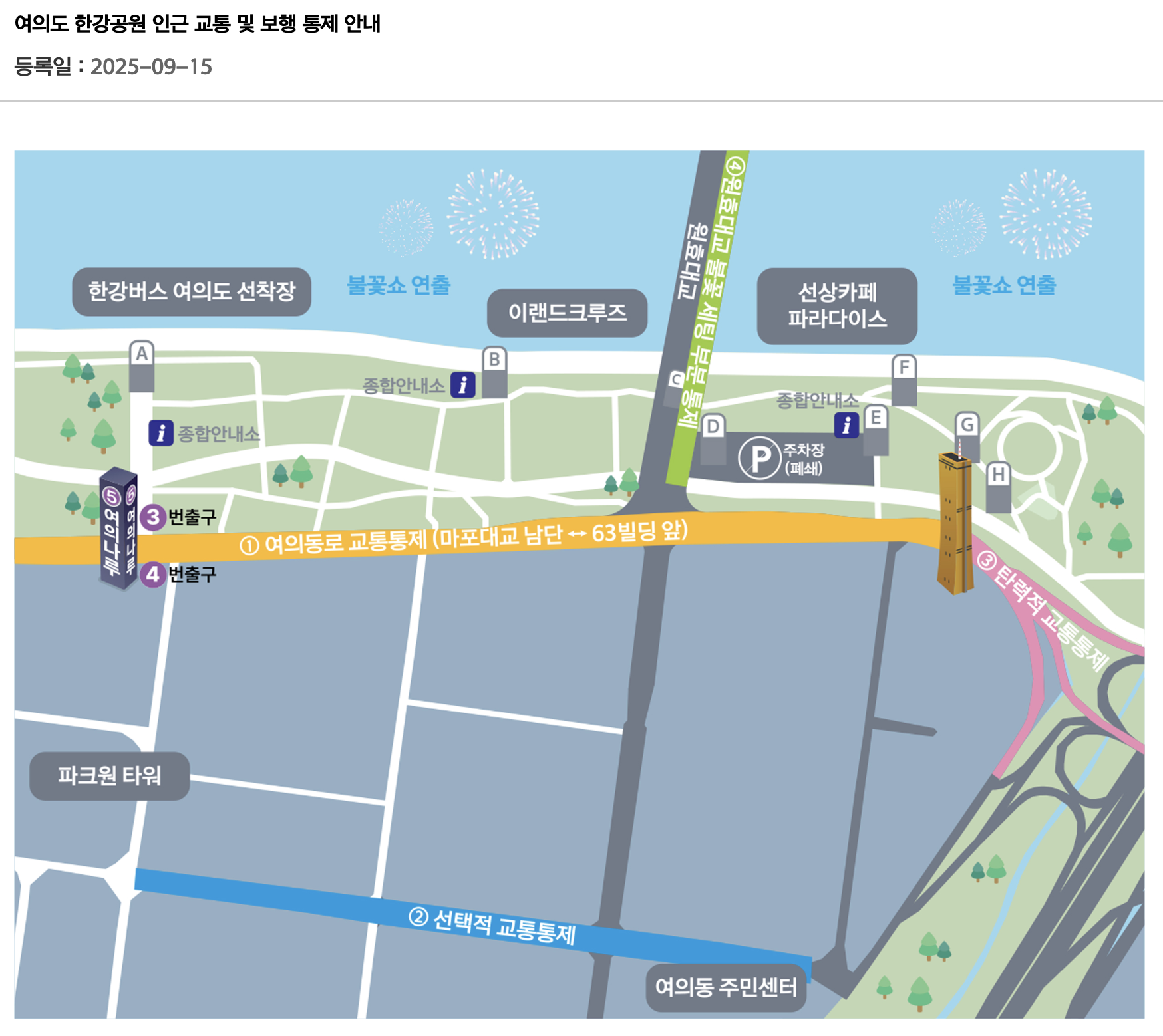 - 귀가 시 주의: 불꽃 종료 직후 여의나루역은 진입 통제 가능 → 한두 정거장 외곽 역으로 이동 후 탑승 권장