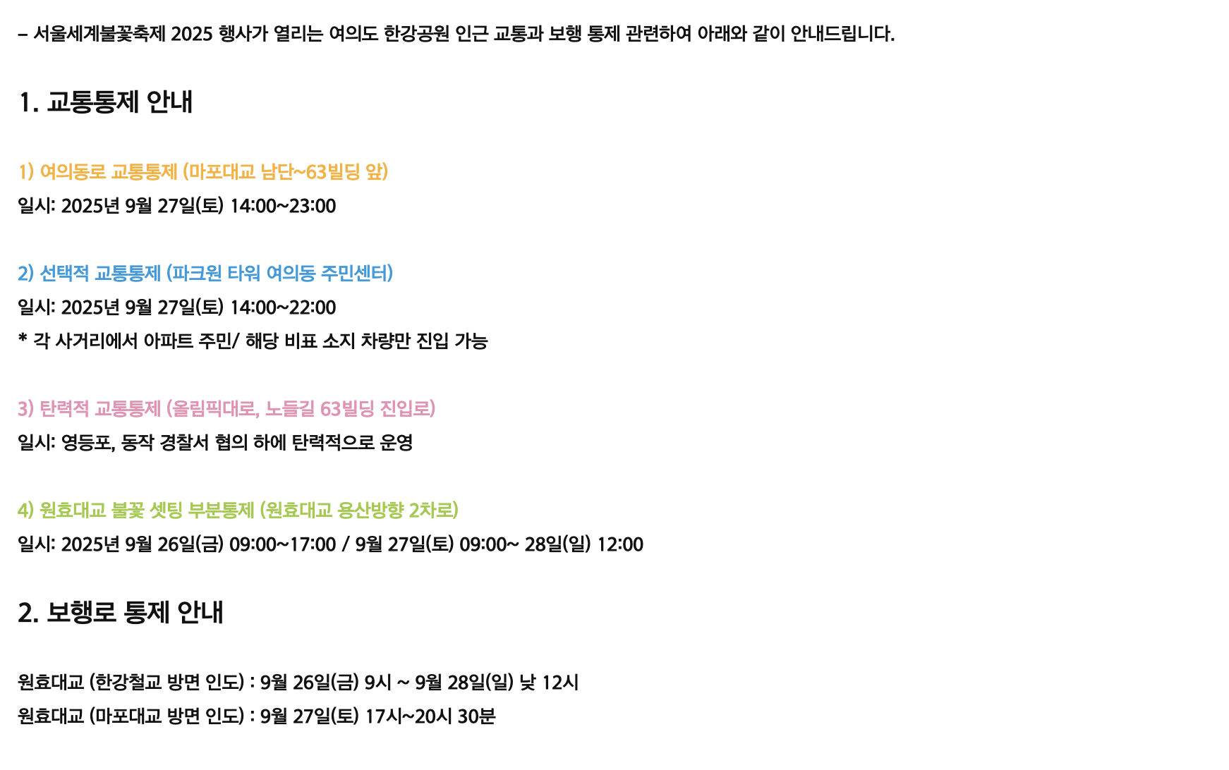 - 행사 당일 여의도 주변 도로 전면 통제 (원효대교~마포대교, 의사당대로 등)