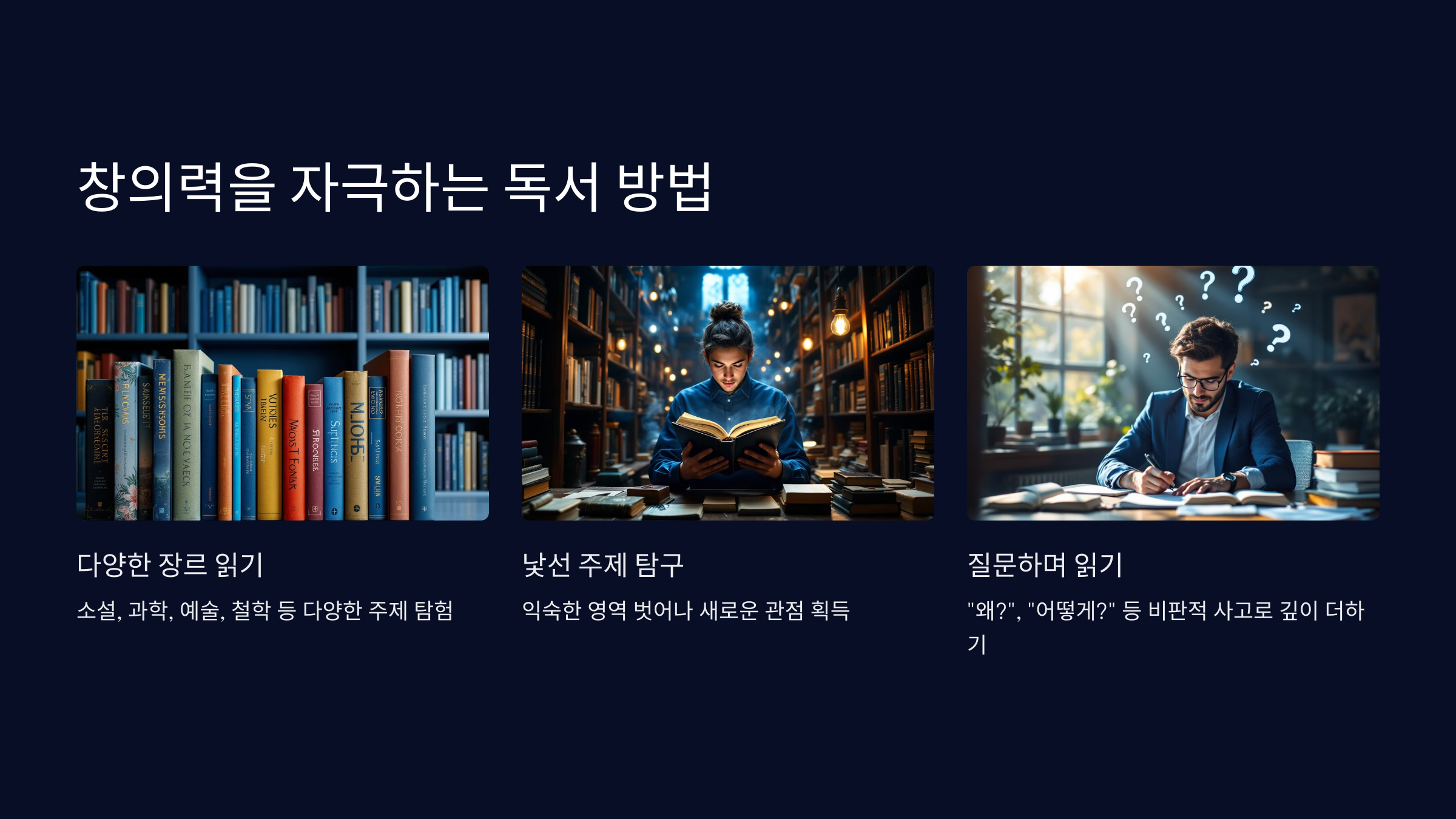 특정 분야에만 국한되지 않고 소설, 과학, 예술, 철학 등 다양한 주제의 책을 읽어보세요. 서로 다른 분야의 지식과 아이디어가 결합될 때 창의적 사고가 촉진됩니다. - 낯선 주제 탐구하기