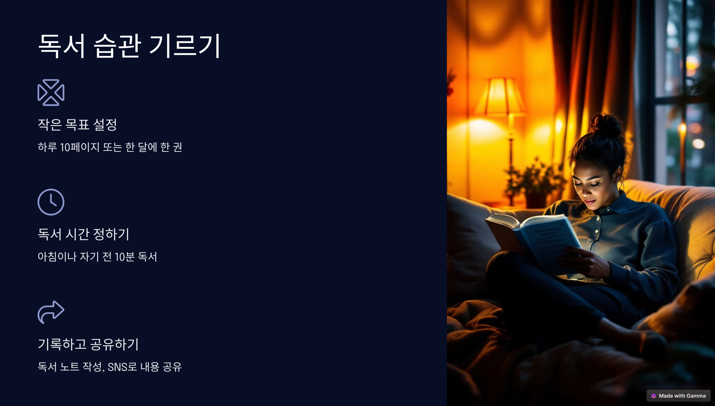 - 하루에 10페이지씩 읽기 또는 한 달에 한 권 읽기 같은 소박한 목표를 설정해 보세요. 작은 목표가 쌓여 큰 변화를 만들 수 있습니다.
