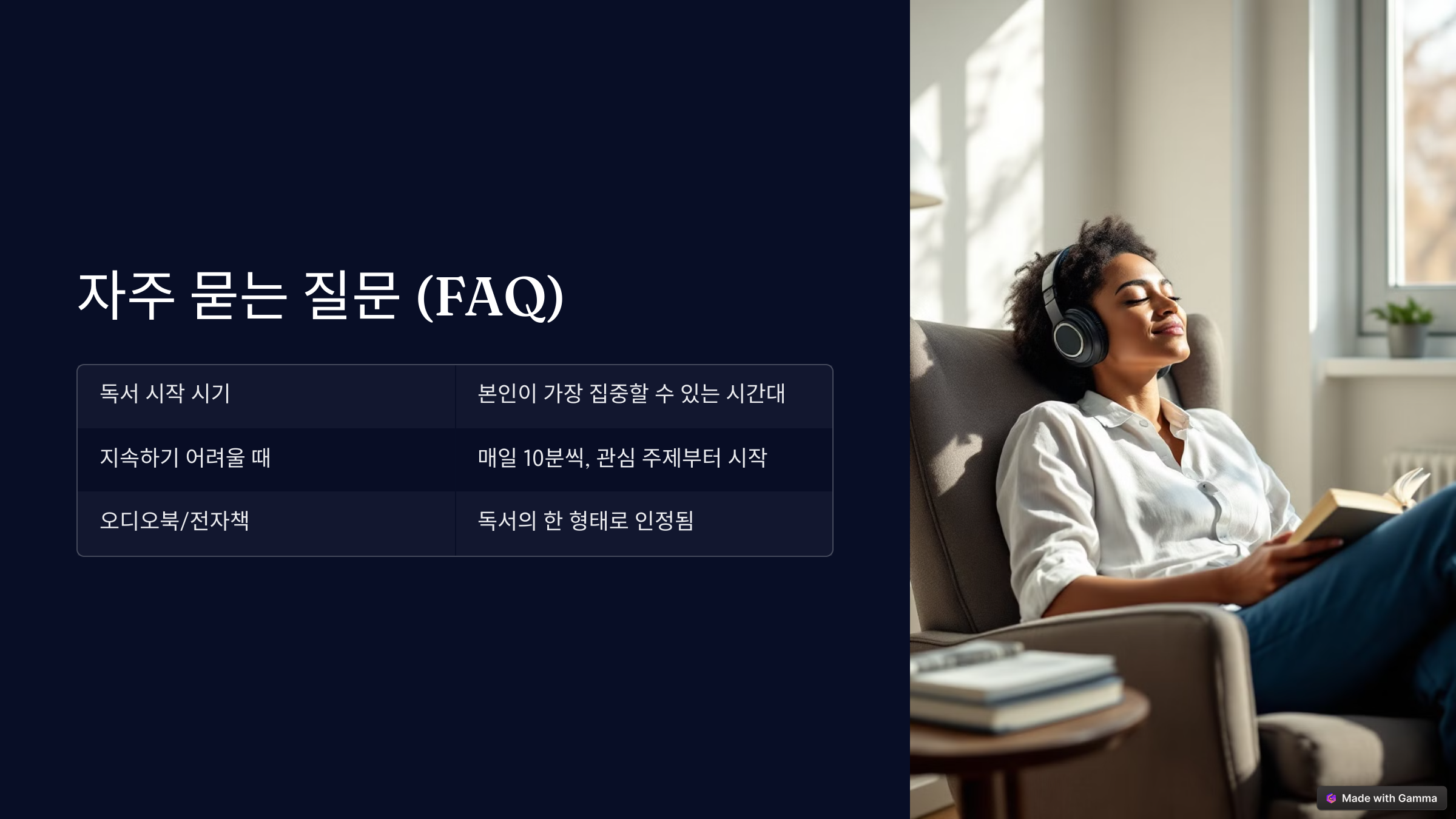 A2. 매일 10분이라도 시간을 정해 두거나, 관심 있는 주제의 짧은 책부터 시작해 보세요. 독서 노트나 SNS를 통해 기록을 남기는 것도 동기 부여에 도움이 됩니다.