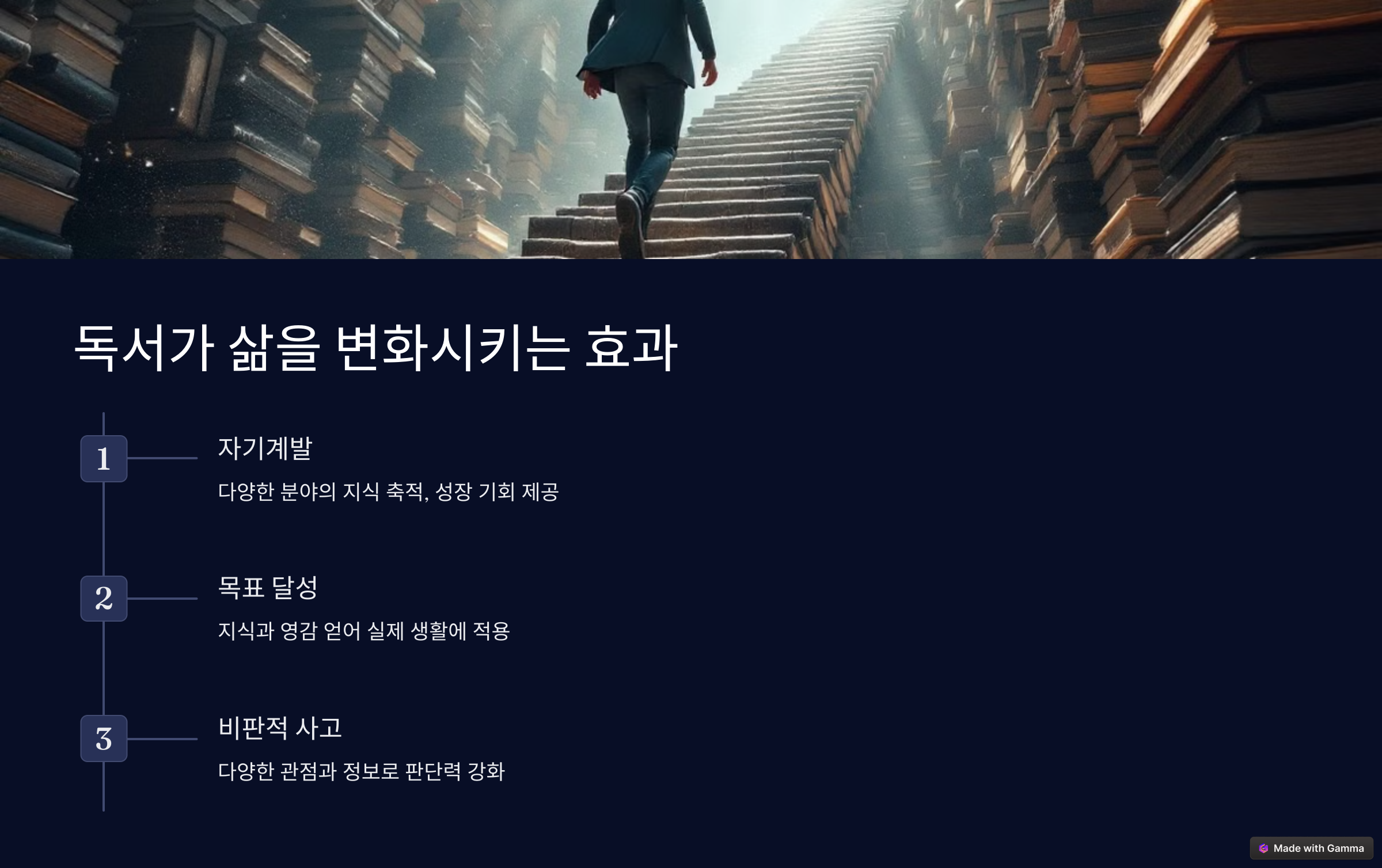 - 독서는 자기 자신을 격려하고 동기 부여를 지속시키는 원천이 되어, 장기적인 목표 달성에 중요한 역할을 합니다.