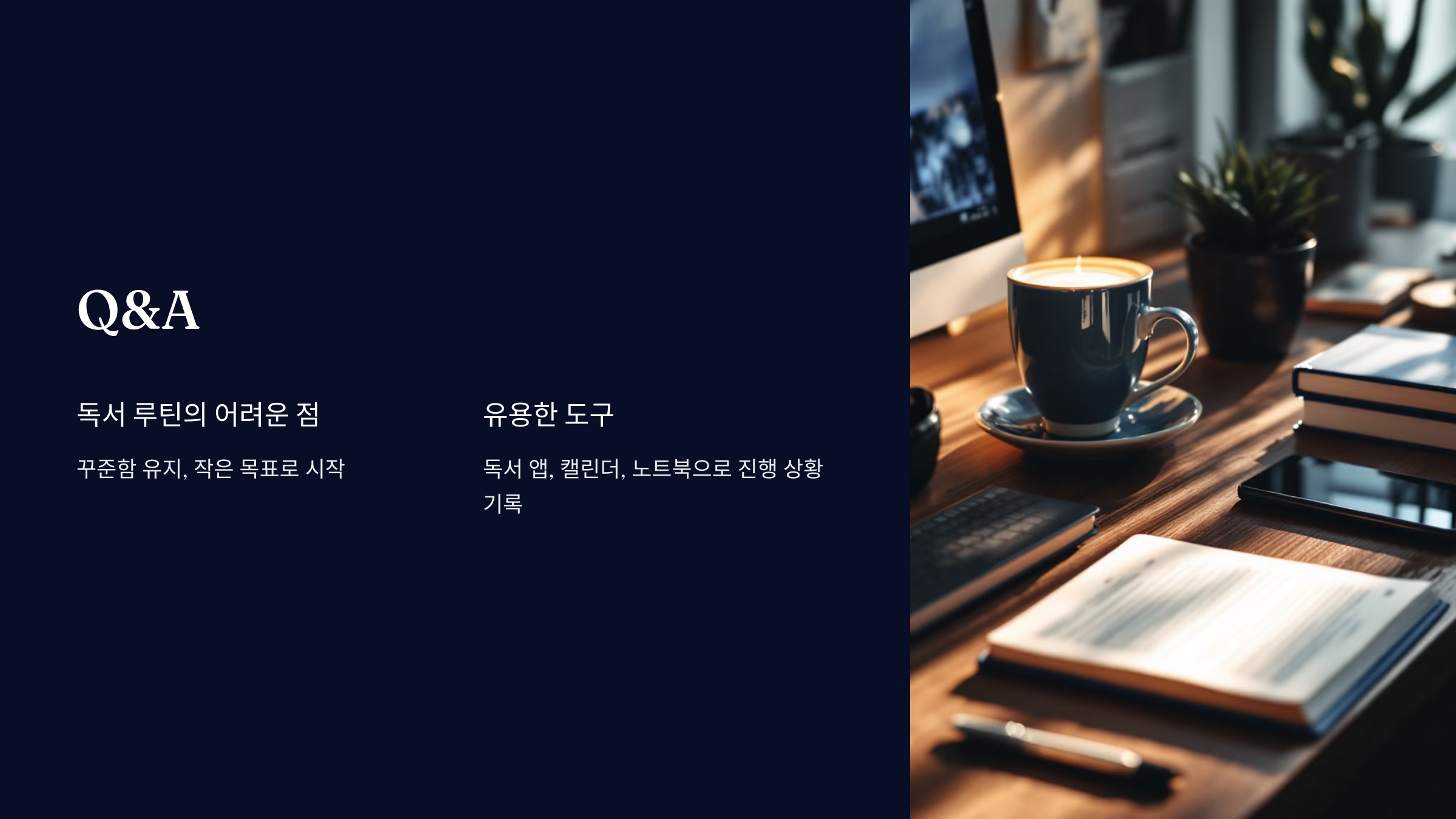 A2. 독서 앱(예: 리디북스, 밀리의 서재)이나 캘린더, 노트북을 활용해 진행 상황을 기록하고, 성과를 시각적으로 확인하세요.