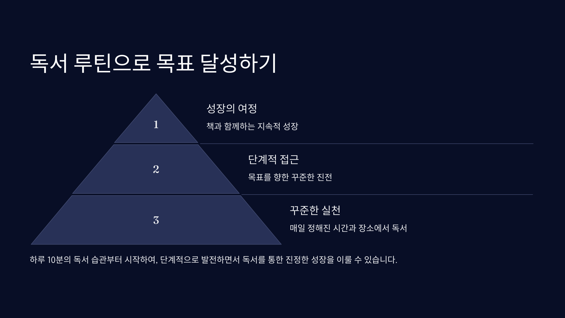 독서 목표를 이루기 위해서는 꾸준히 실천할 수 있는 루틴을 만드는 것이 중요합니다. 하루 10분이라도 일정한 시간과 장소에서 책을 읽는 습관을 통해 목표를 향해 한 걸음씩 나아가세요. 지금 바로 자신만의 독서 루틴을 설계하고, 책과 함께 성장하는 여정을 시작해 보세요!