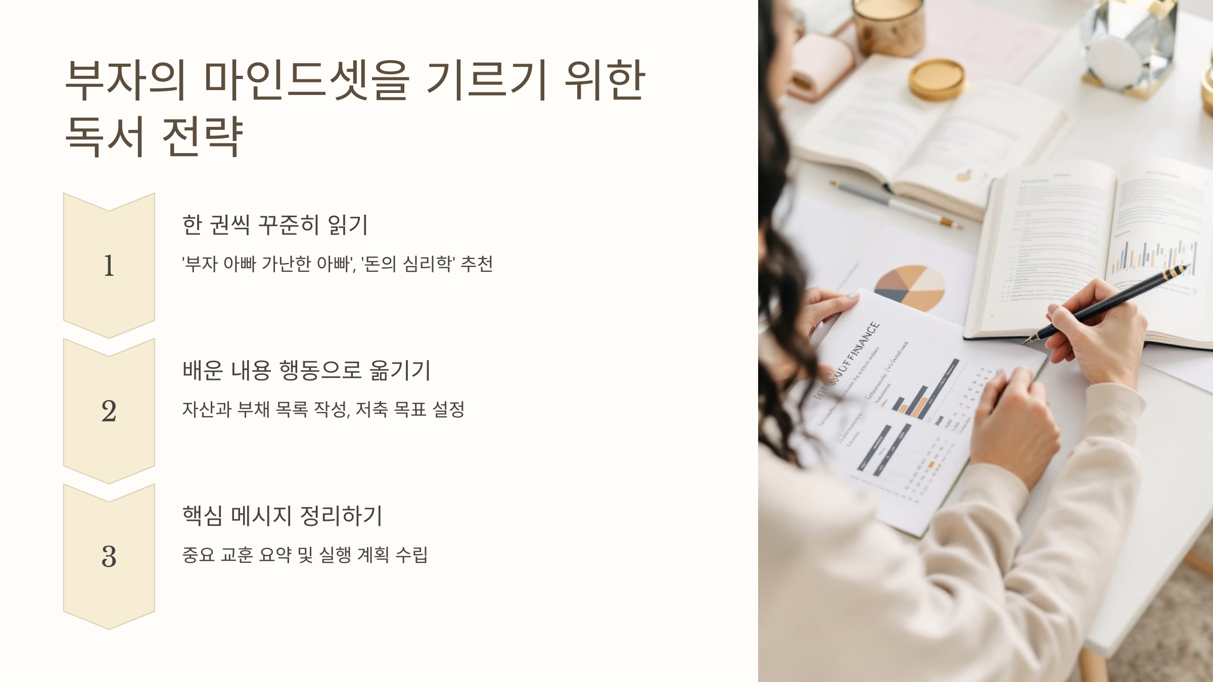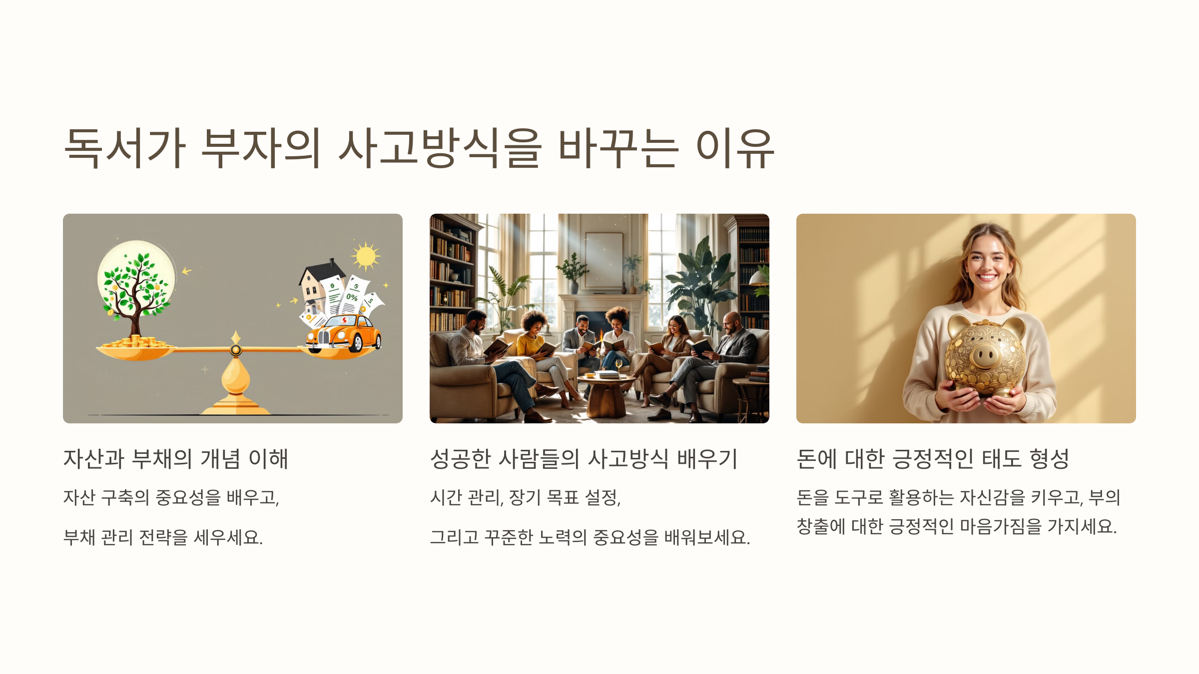 독서는 돈에 대해 막연히 부정적이거나 두려워했던 태도를 긍정적이고 전략적으로 바꾸는 데 도움을 줍니다.