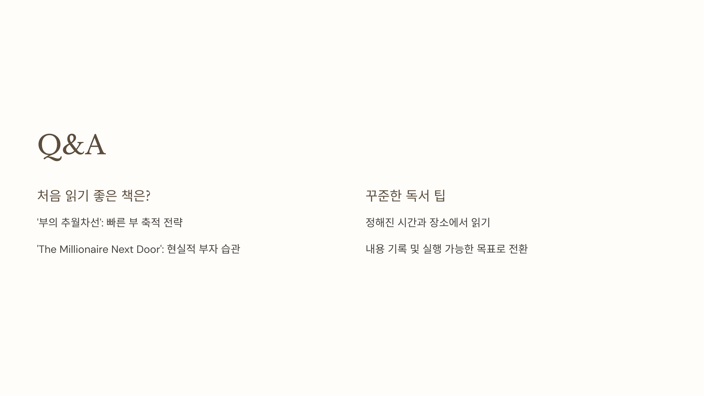A1. *"부의 추월차선"은 빠른 부의 축적을 위한 전략을 배우기에 좋습니다. 또, *"The Millionaire Next Door"는 현실적인 부자들의 습관을 알게 합니다.