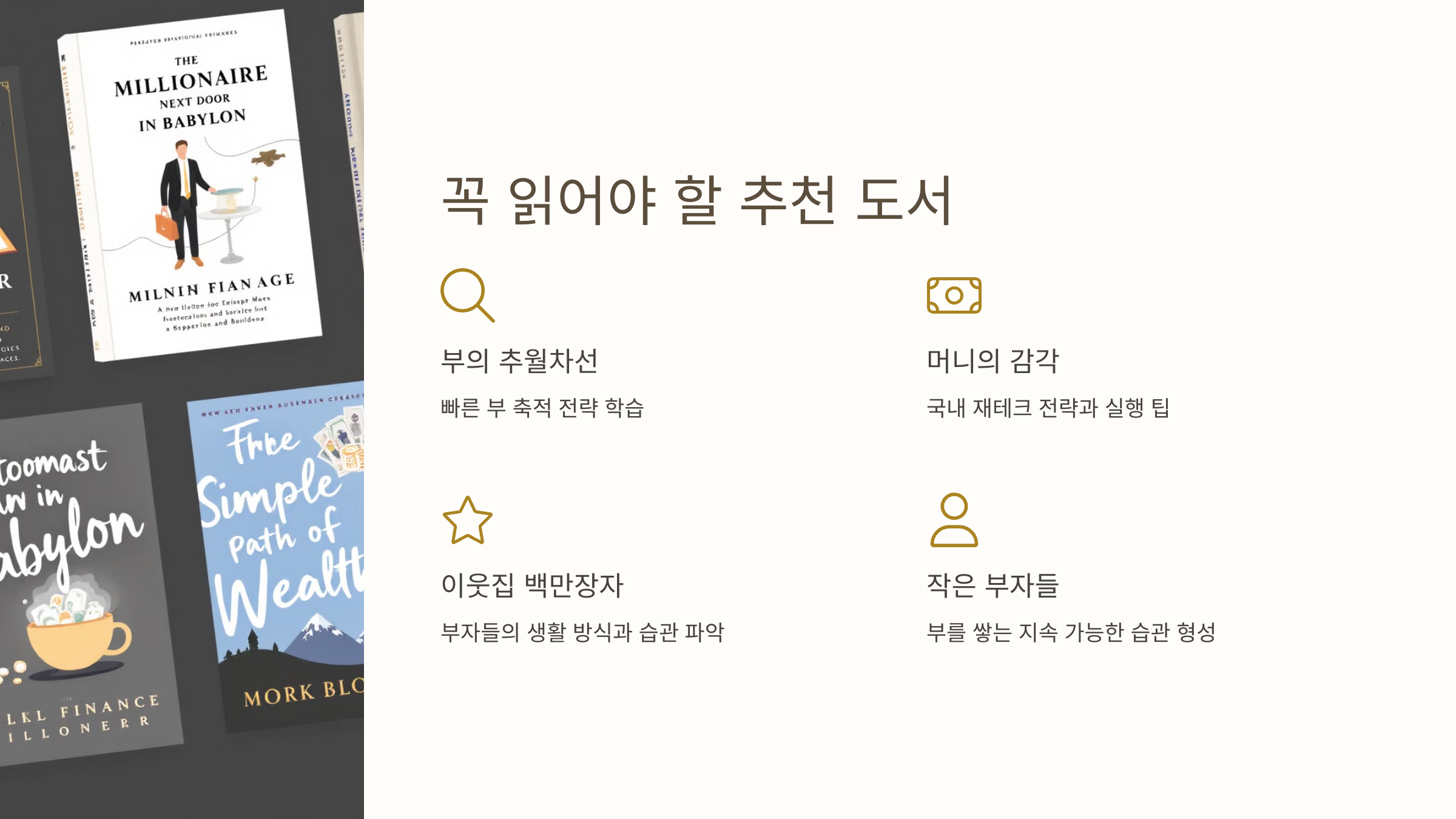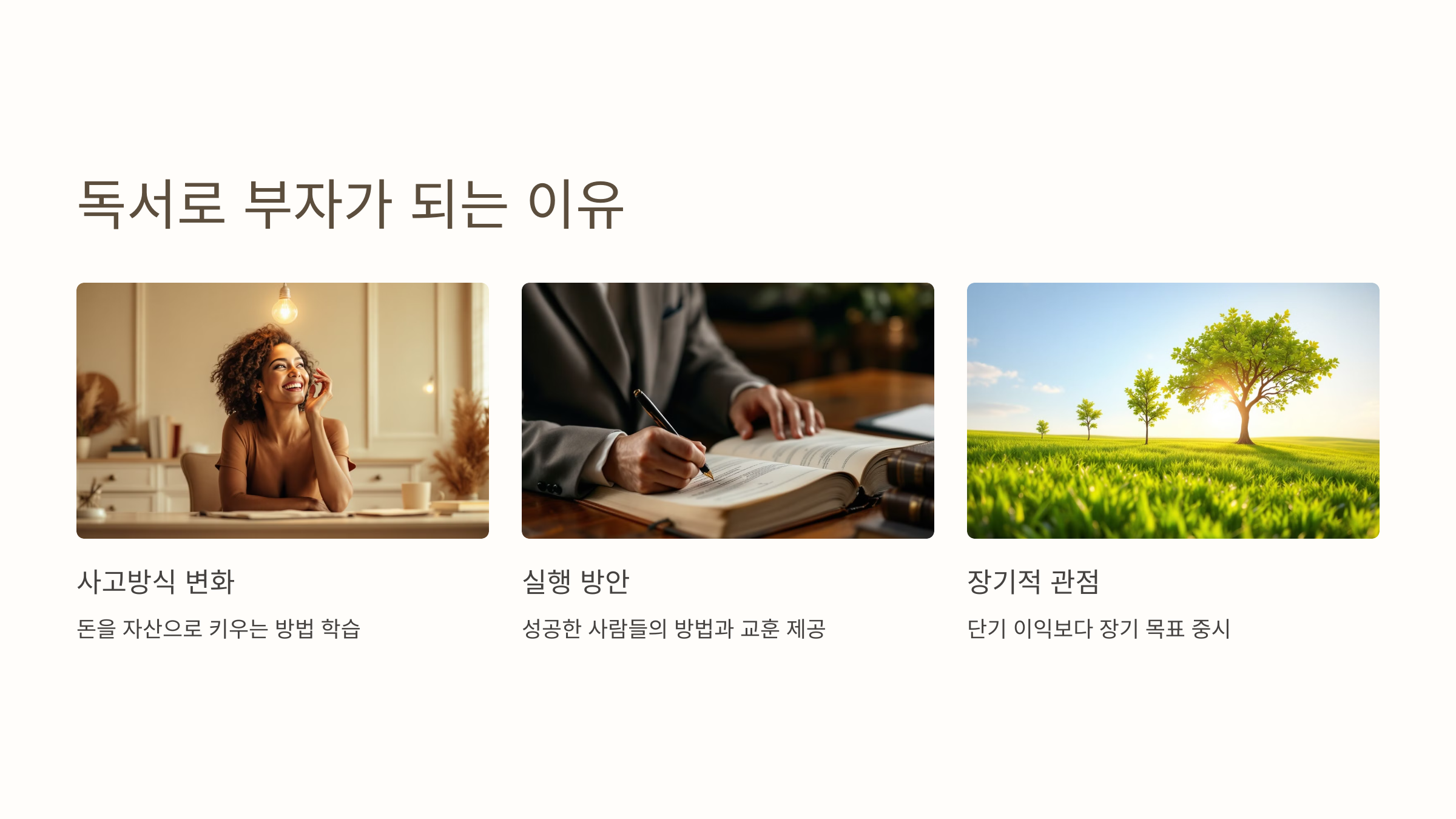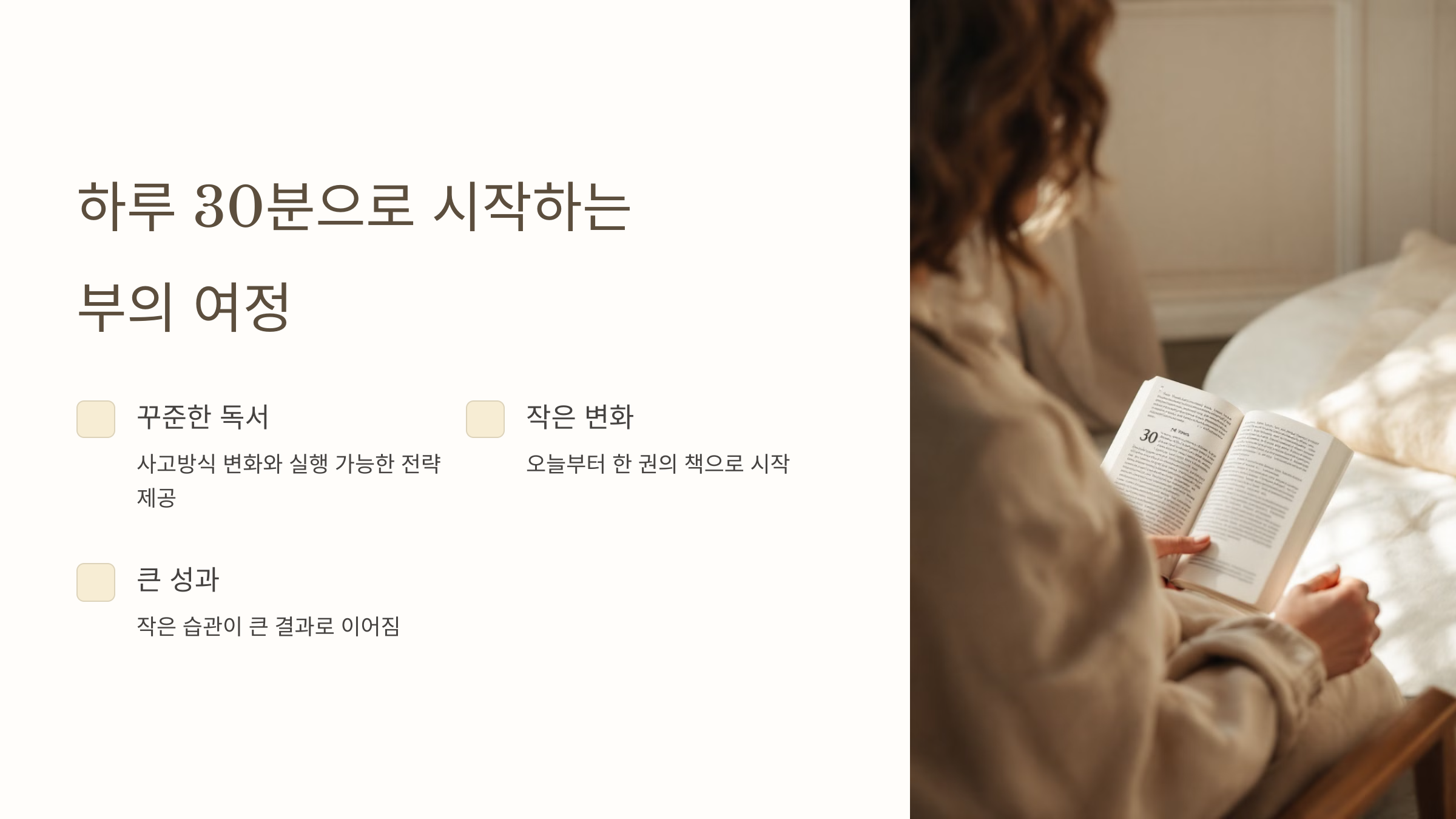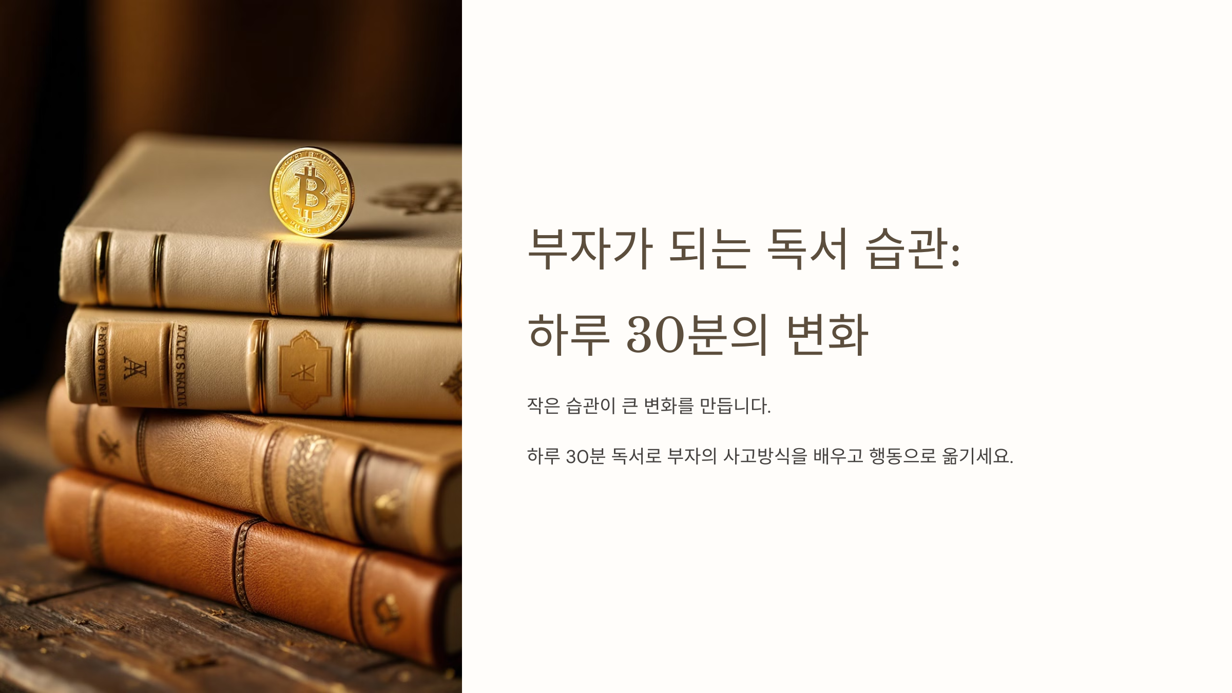 부자가 되기 위한 여정은 하루 30분의 독서에서 시작할 수 있습니다. 꾸준한 독서는 사고방식을 바꾸고, 실행 가능한 전략을 제공합니다. 오늘 한 권의 책을 선택해 작은 변화부터 시작해 보세요. 이 작은 습관이 큰 성과로 이어질 것입니다.