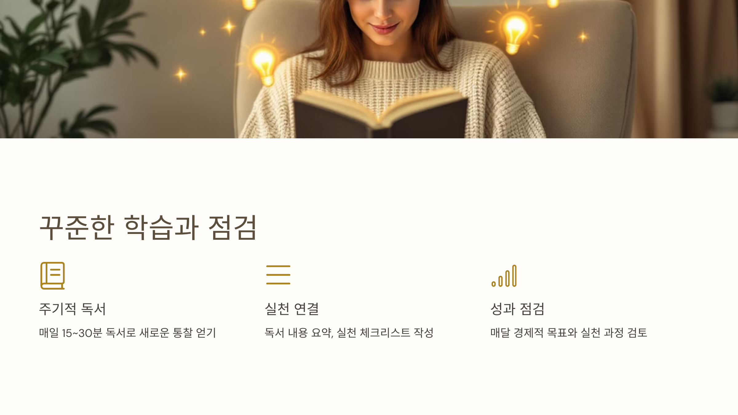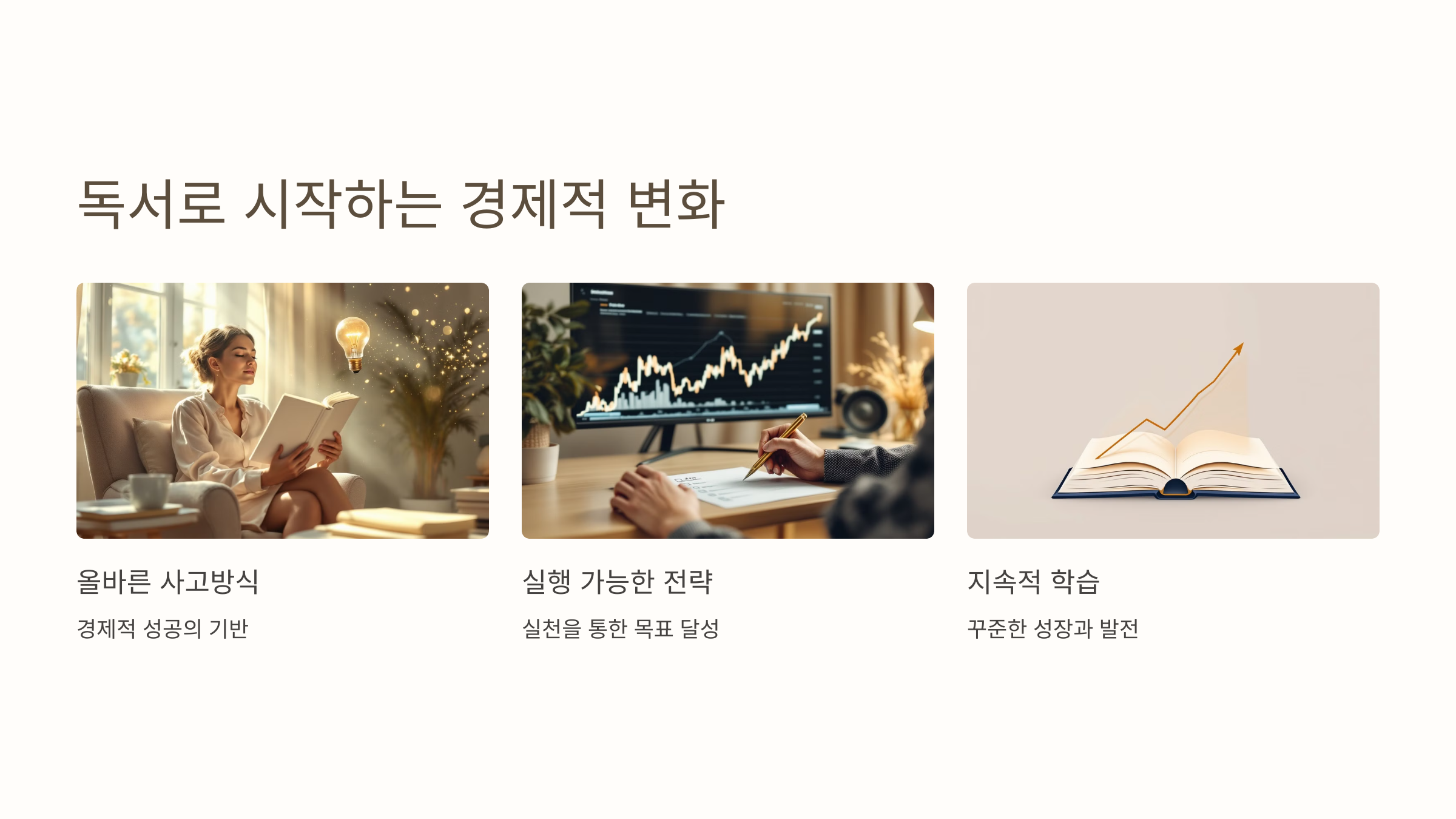 독서는 경제적 성공을 위한 첫걸음입니다. 올바른 사고방식을 배우고, 이를 실행 가능한 전략으로 연결하며, 지속적으로 학습하면 누구나 경제적 목표를 이룰 수 있습니다. 지금 한 권의 책을 선택해 실천 가능한 작은 목표부터 시작해 보세요. 오늘의 작은 변화가 내일의 큰 성과로 이어질 것입니다.