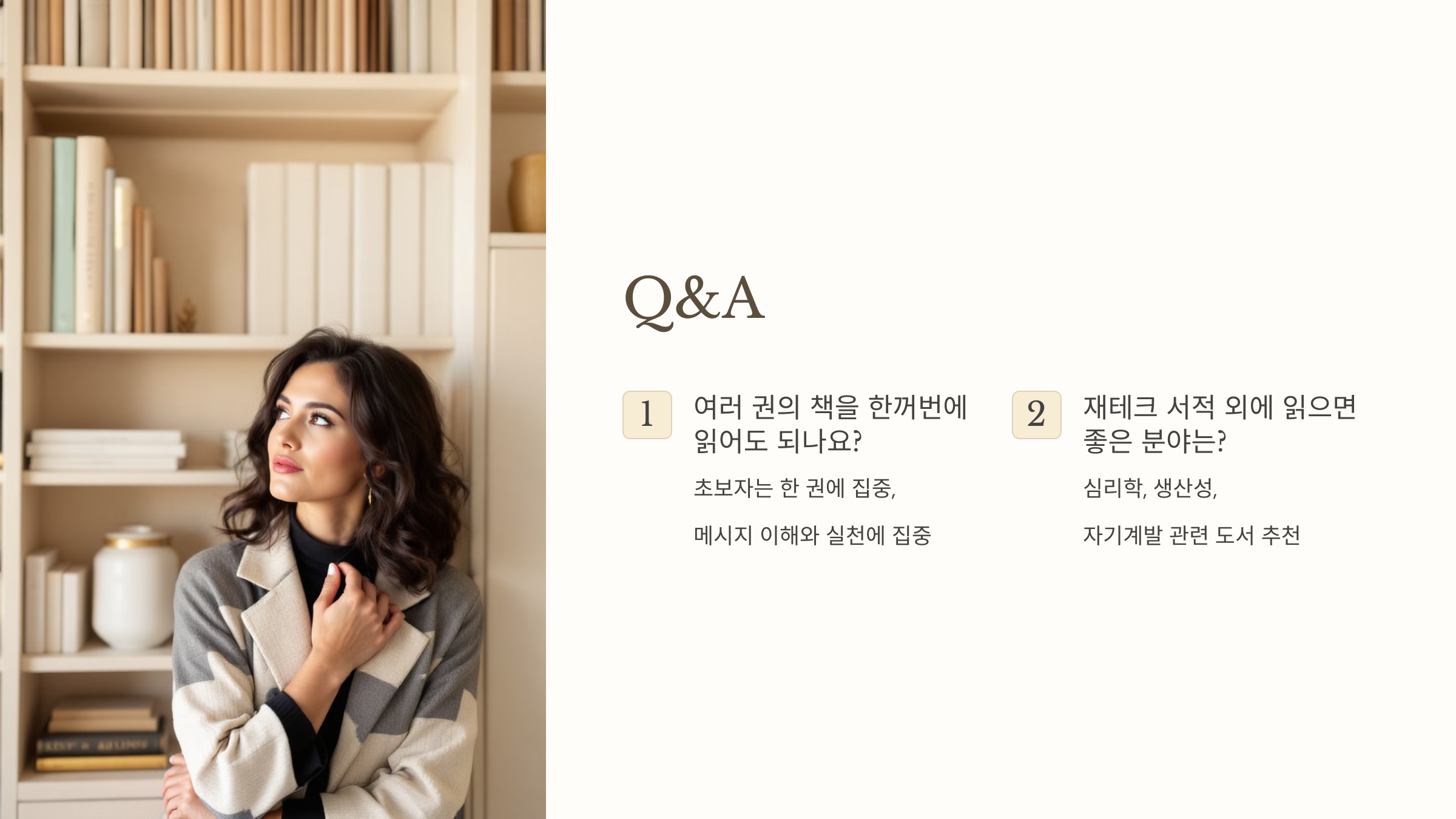 A1. 초보자라면 한 권에 집중하는 것이 좋습니다. 중요한 메시지를 충분히 이해하고, 이를 실천하는 데 집중하세요.