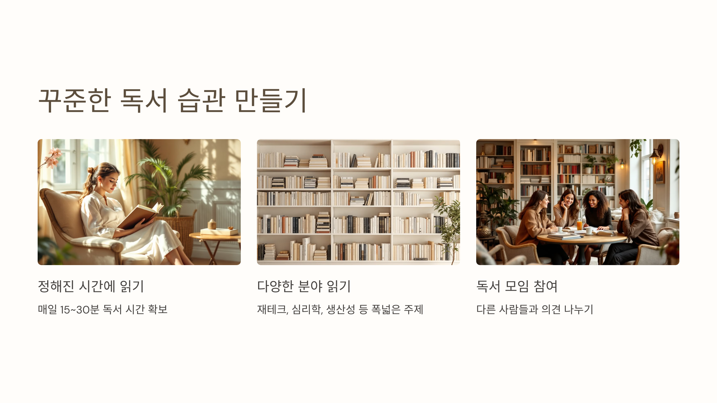 매일 15~30분 정도 정해진 시간에 책을 읽는 습관을 만드세요.- 팁: 아침이나 자기 전 시간을 활용하면 집중도가 높아집니다.