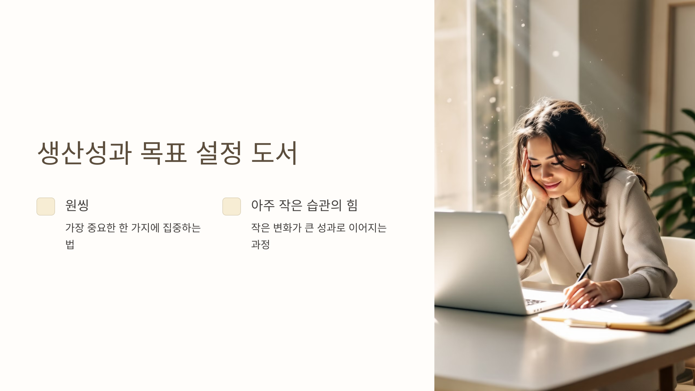 작은 변화가 쌓여 큰 성과로 이어지는 과정을 설명합니다.- 핵심 메시지: 매일의 작은 습관이 장기적으로 큰 변화를 만들어낸다.
