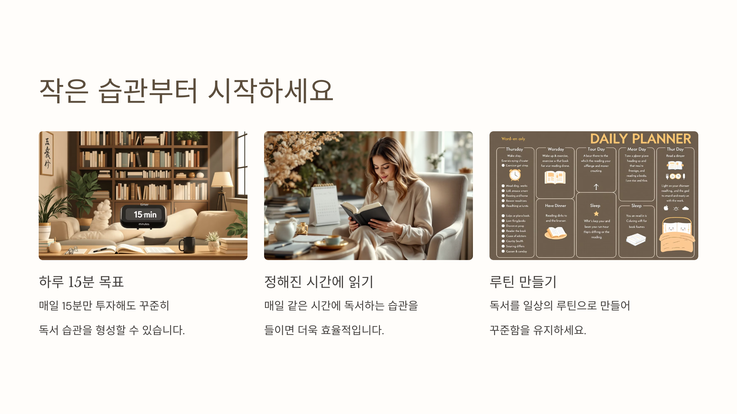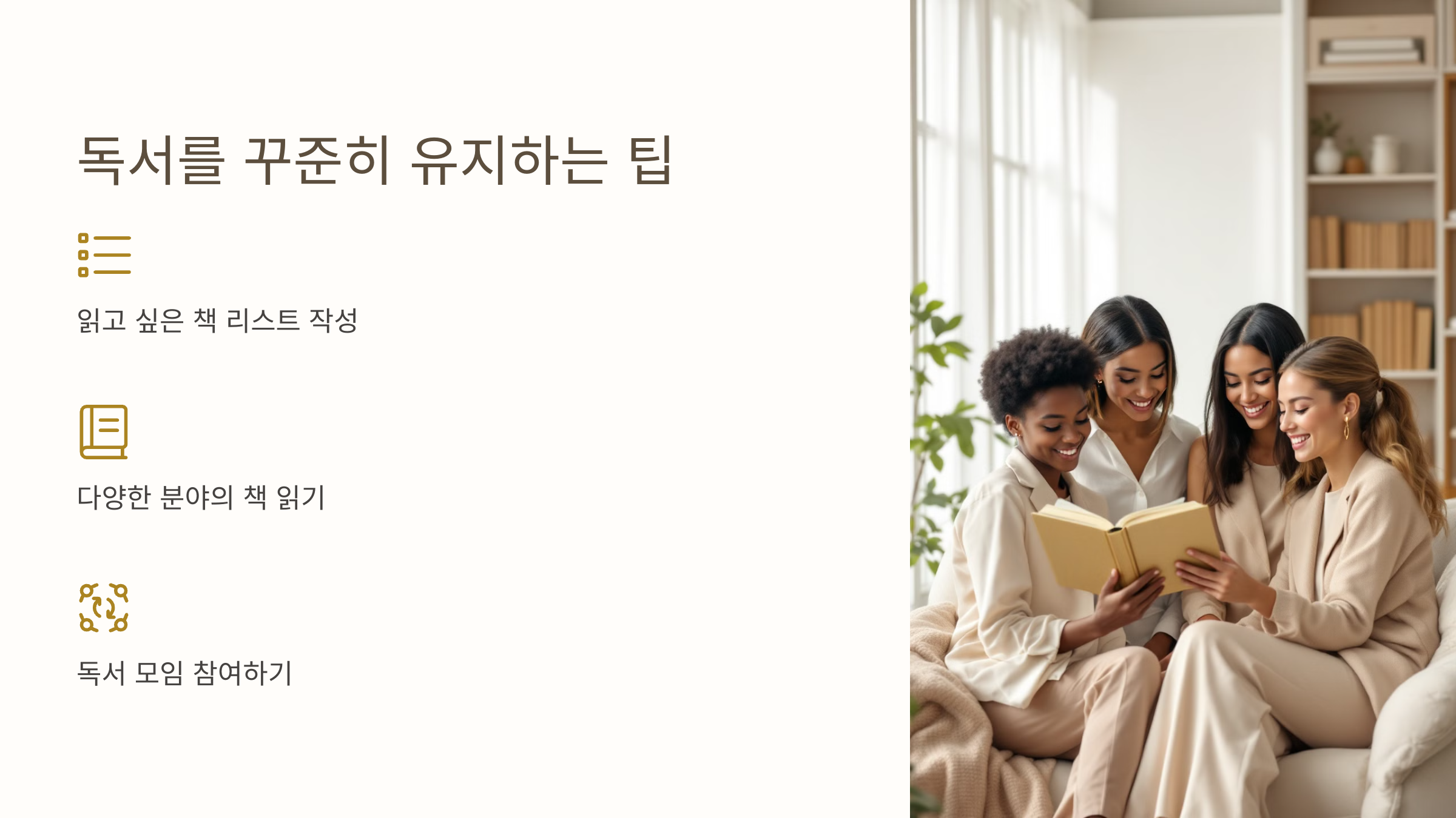 아침, 점심시간, 자기 전 등 하루 중 일정한 시간을 정해 매일 같은 시간에 읽는 루틴을 만들어 보세요.- 예: "저녁 9시에는 무조건 책을 읽겠다."