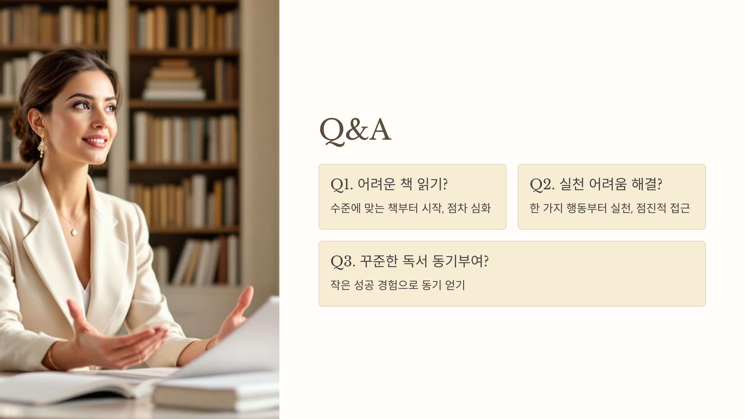 A3. 작은 성공 경험이 동기부여가 됩니다. 짧은 책이나 쉬운 주제부터 시작해 한 권을 끝냈다는 성취감을 느껴보세요.