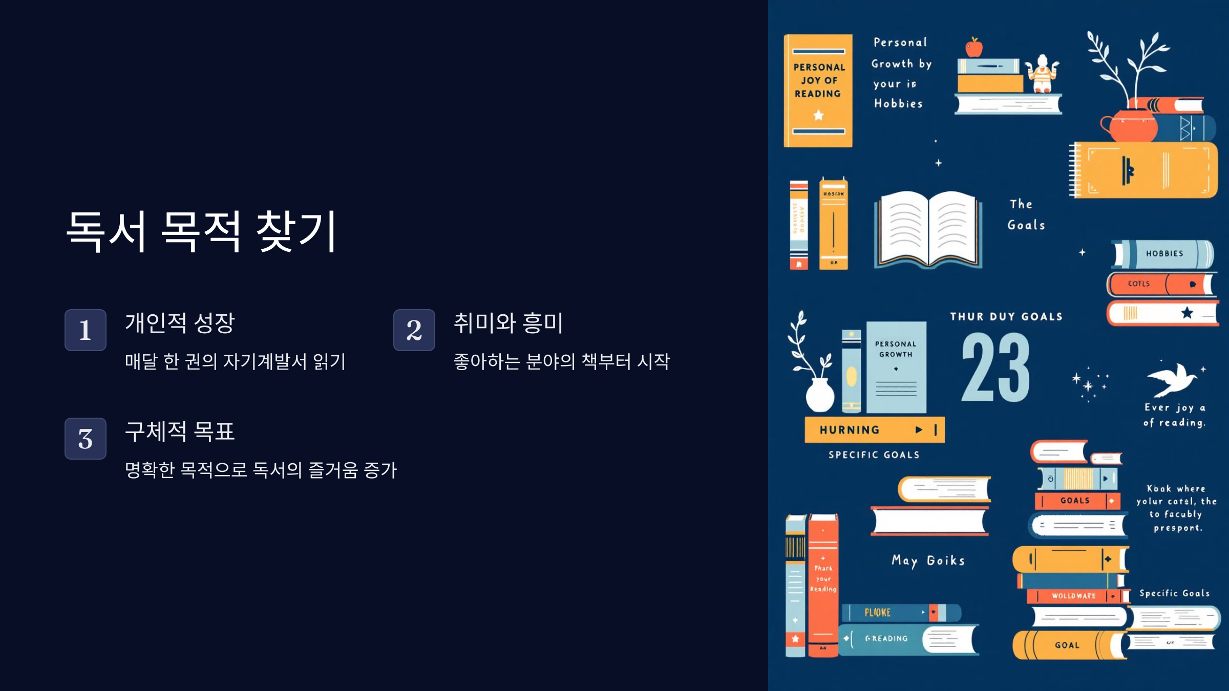 독서를 꾸준히 하기 위해서는 자신만의 ‘독서 목적’을 찾는 것이 중요합니다. 단순한 시간 때우기가 아닌, 자신에게 가치 있는 목표를 세워보세요.