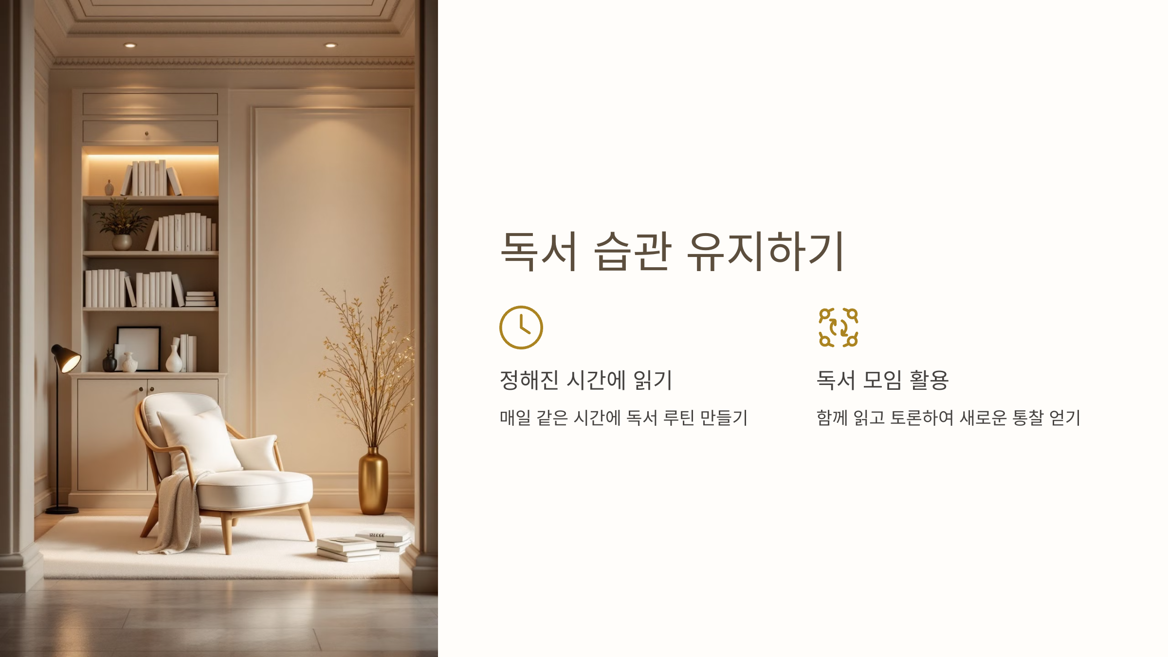 매일 같은 시간에 읽는 루틴을 만들어 독서를 생활화하세요.- 예: 자기 전 15분, 아침 출근 전 10분.
