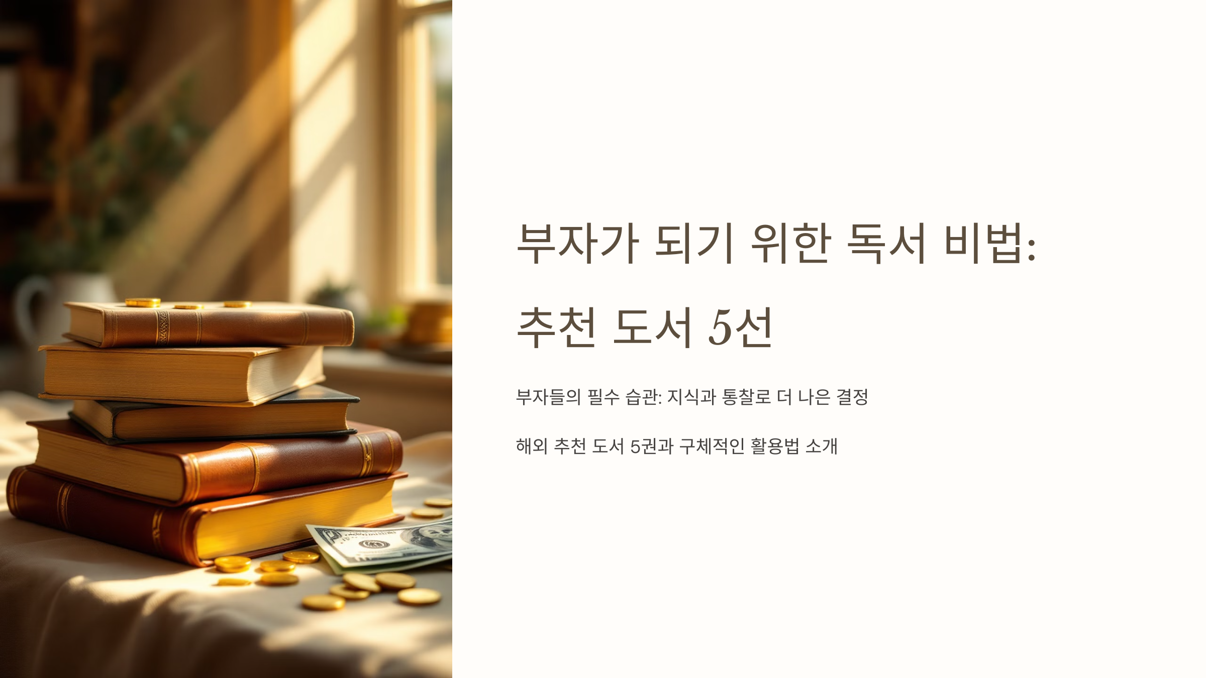 부자들이 독서를 필수 습관으로 삼는 이유는 지식과 통찰을 통해 더 나은 결정을 내리기 위해서입니다. 오늘은 부자가 되기 위해 꼭 읽어야 할 해외 추천 도서 5권과 함께, 이 책들을 어떻게 활용할지 구체적인 방법을 소개합니다.