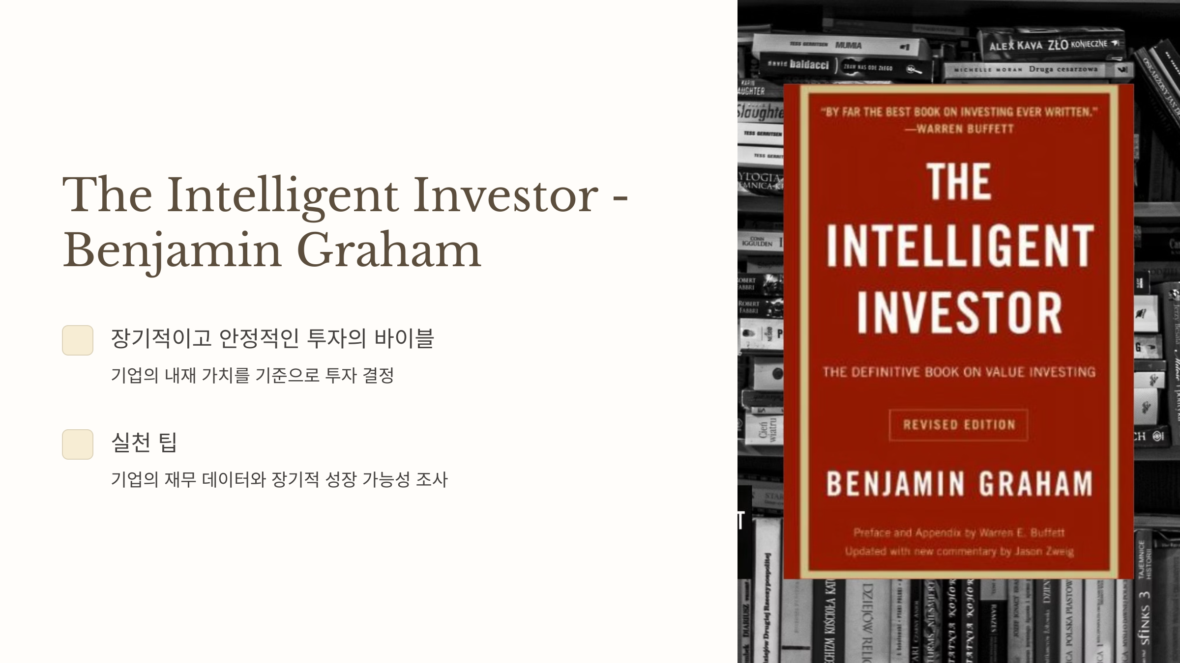 가치 투자에 대한 바이블로 불리는 이 책은 장기적이고 안정적인 투자를 배우는 데 필수입니다. 워런 버핏도 이 책에서 투자 철학을 배웠다고 합니다.