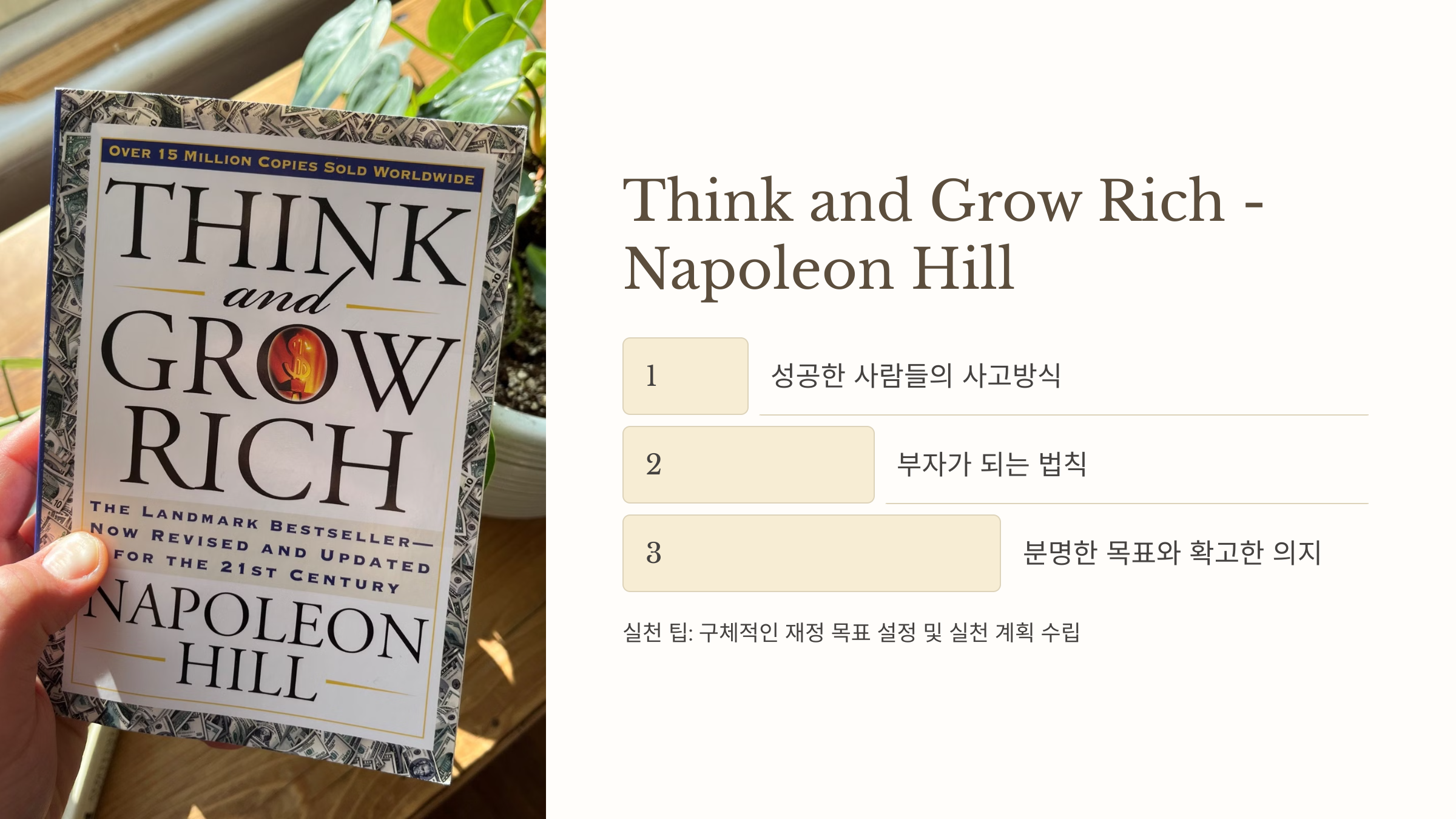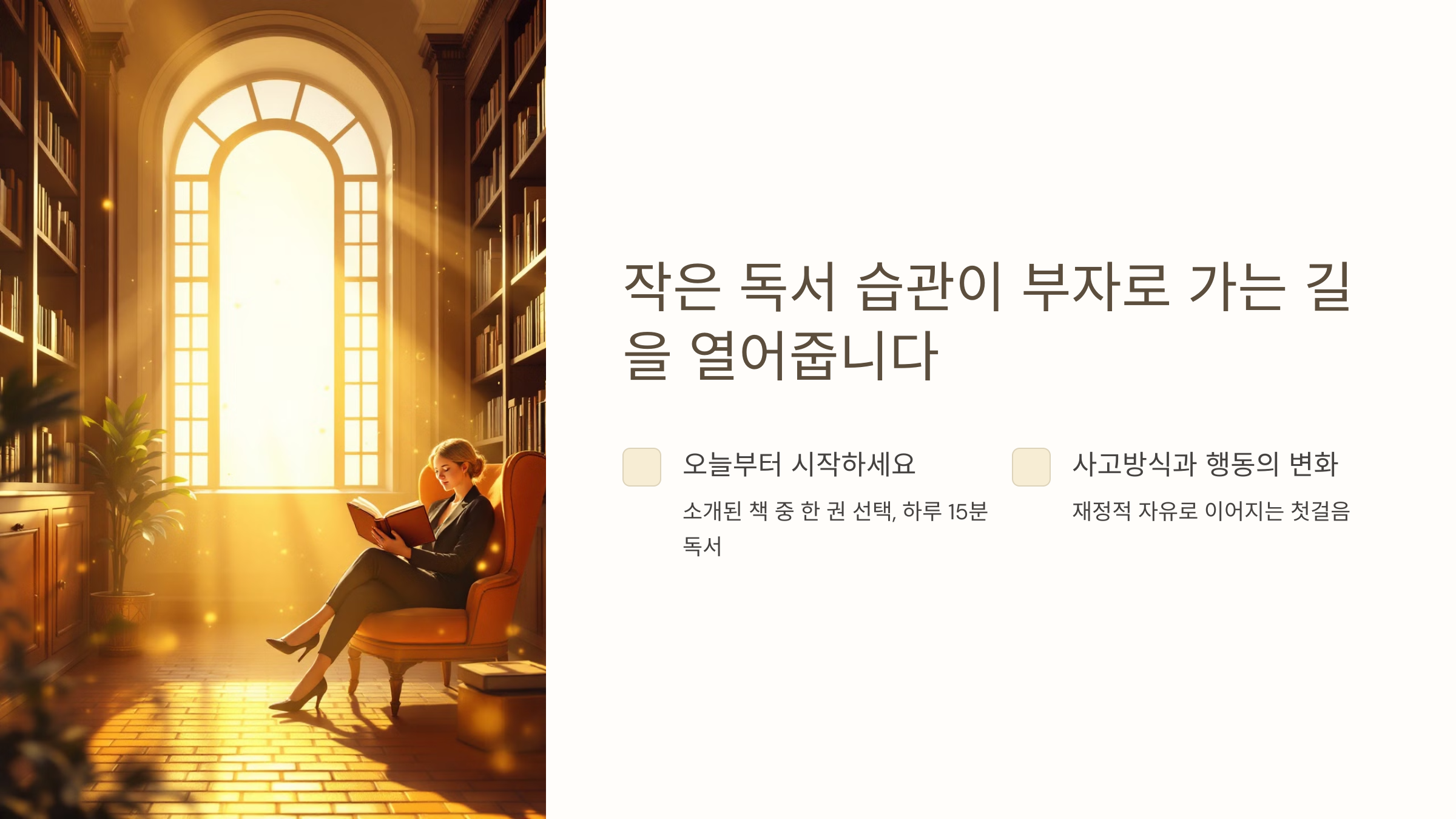 부자가 되는 비결은 복잡하지 않습니다. 오늘 소개된 책 중 한 권을 골라 읽기 시작하세요. 하루 15분의 독서가 당신의 사고방식과 행동을 변화시키고, 결국 재정적 자유로 이끌 것입니다.