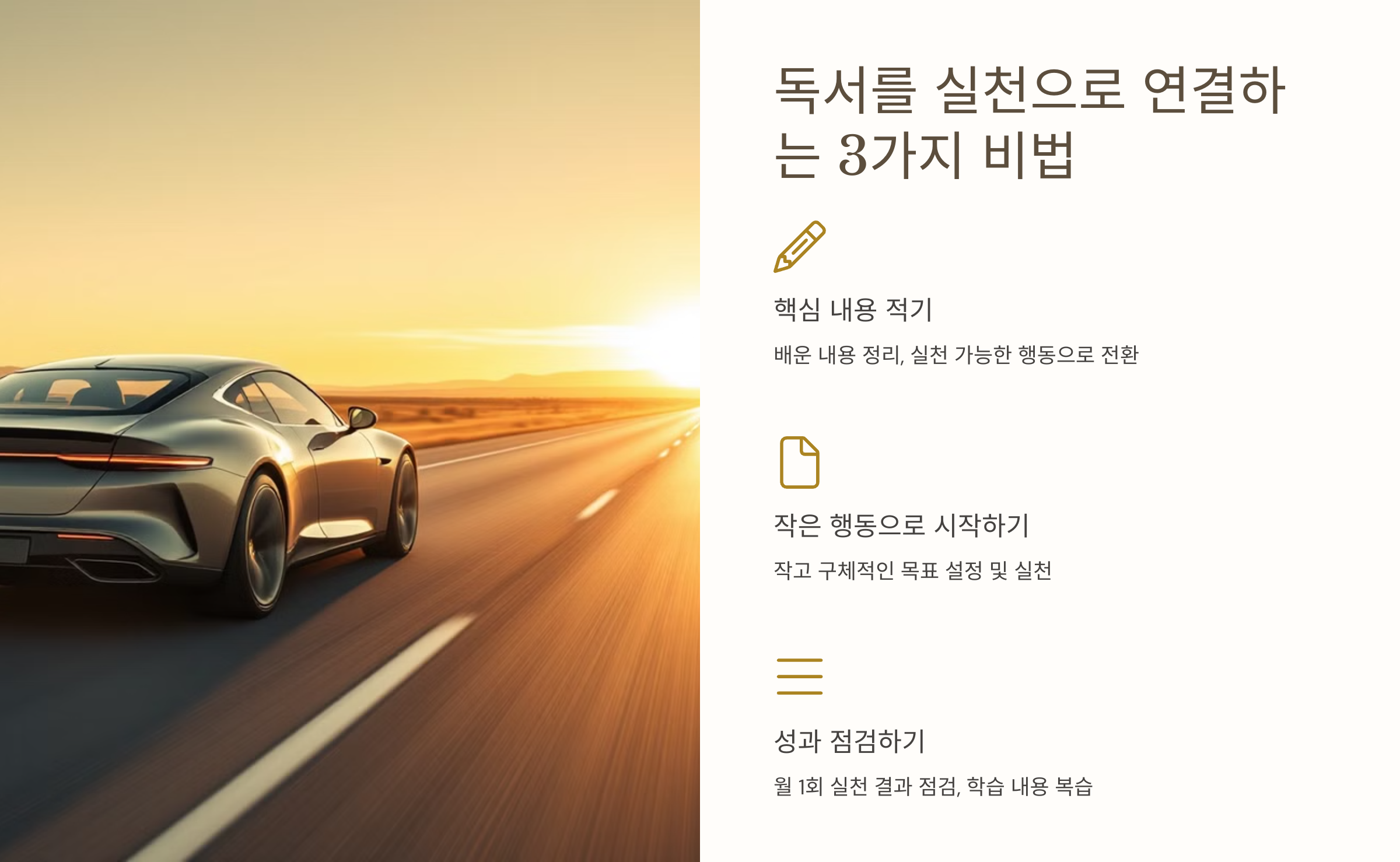 책을 읽으면서 배운 내용을 간단히 정리하고, 이를 실천 가능한 행동으로 바꿔보세요.
