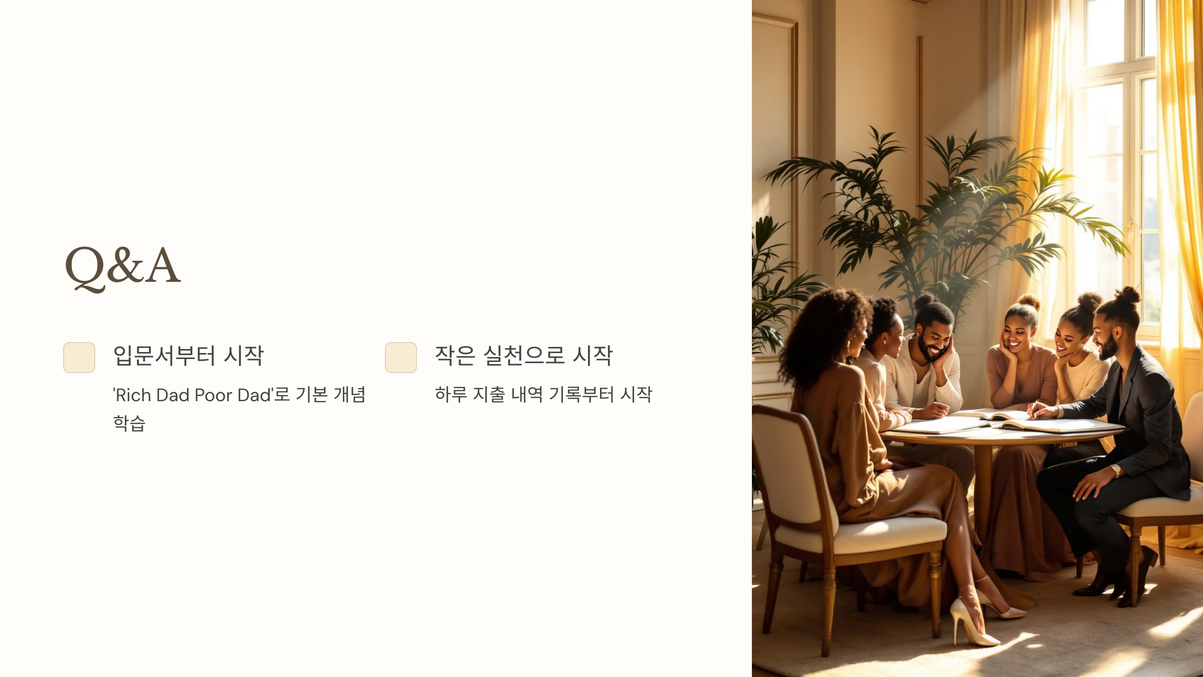 A1. 처음에는 쉬운 입문서부터 시작하세요. *"Rich Dad Poor Dad"*는 자산과 부채의 기본 개념을 배우기에 적합합니다.