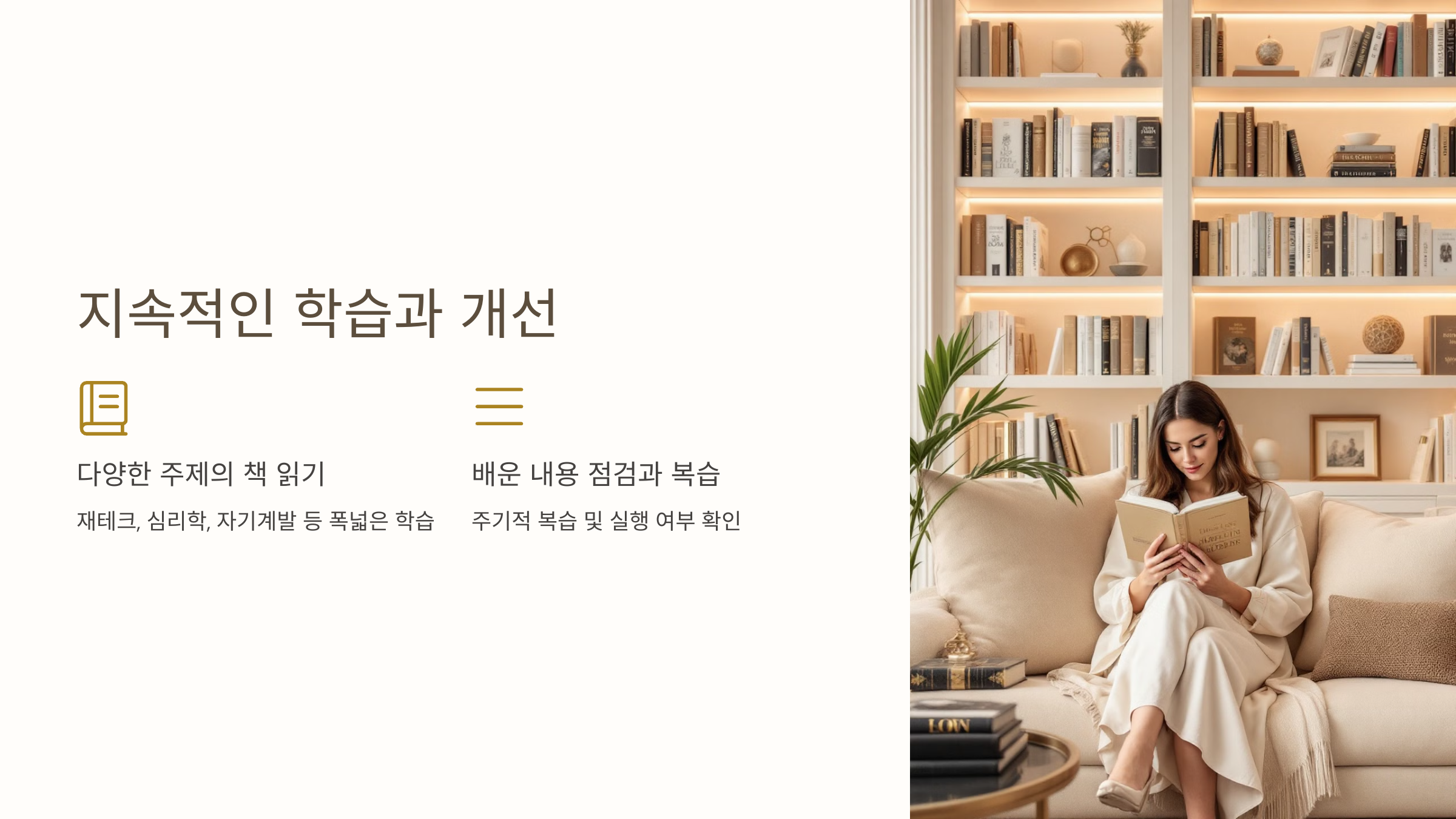 재테크뿐 아니라 심리학, 자기계발, 생산성 관련 도서를 통해 사고의 폭을 넓히세요.- 추천 도서: