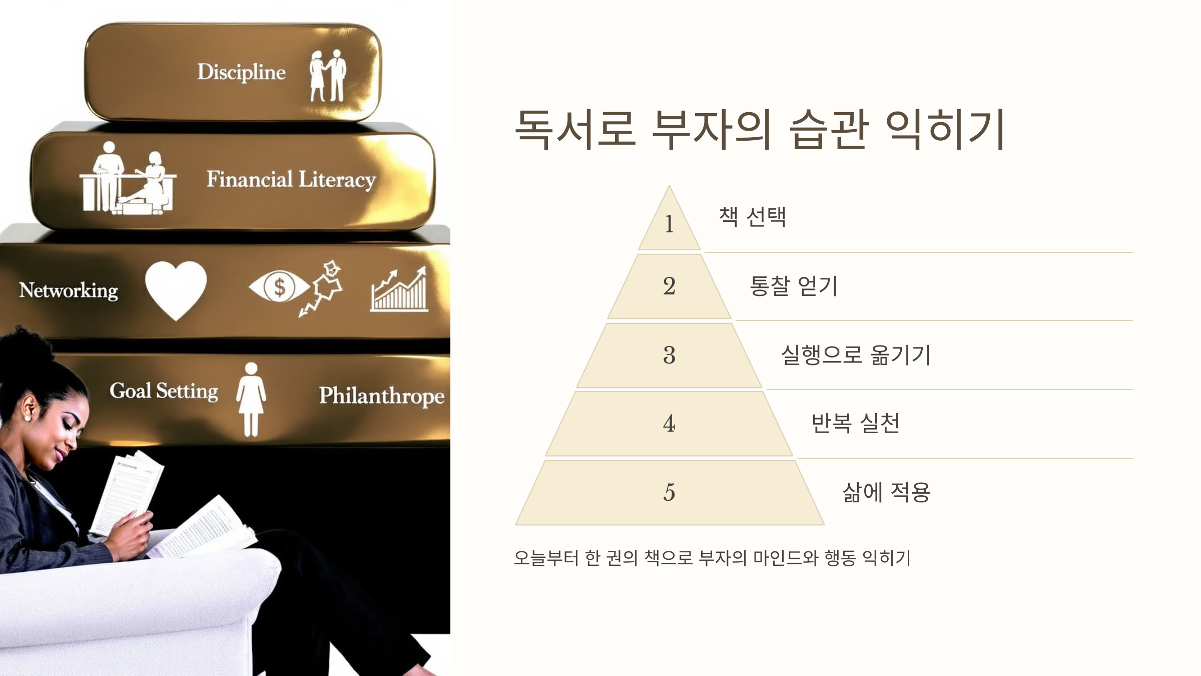 독서는 부자들의 성공 습관을 배우는 가장 빠른 길입니다. 책에서 얻은 통찰을 실행으로 옮기고,