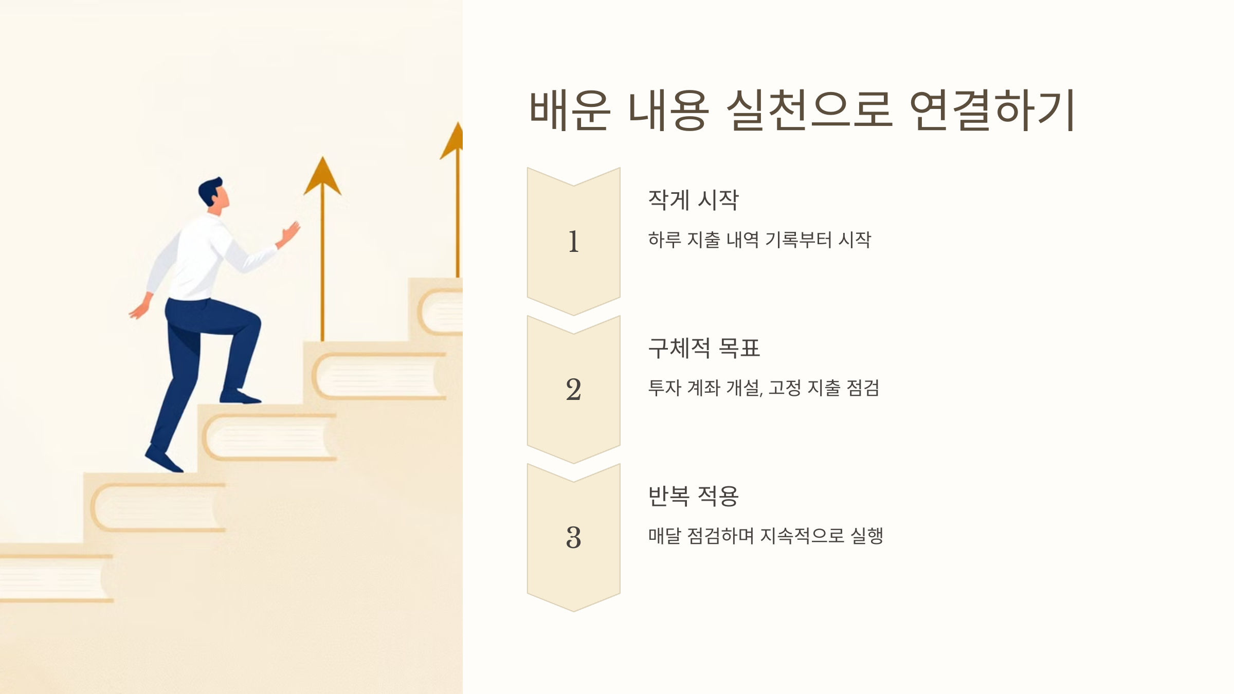큰 변화를 시도하기보다는, 작고 쉬운 행동부터 시작하세요.- 예: 하루 지출 내역 기록 → 한 달 예산 계획 작성 → 월 소득의 10% 저축 및 투자.