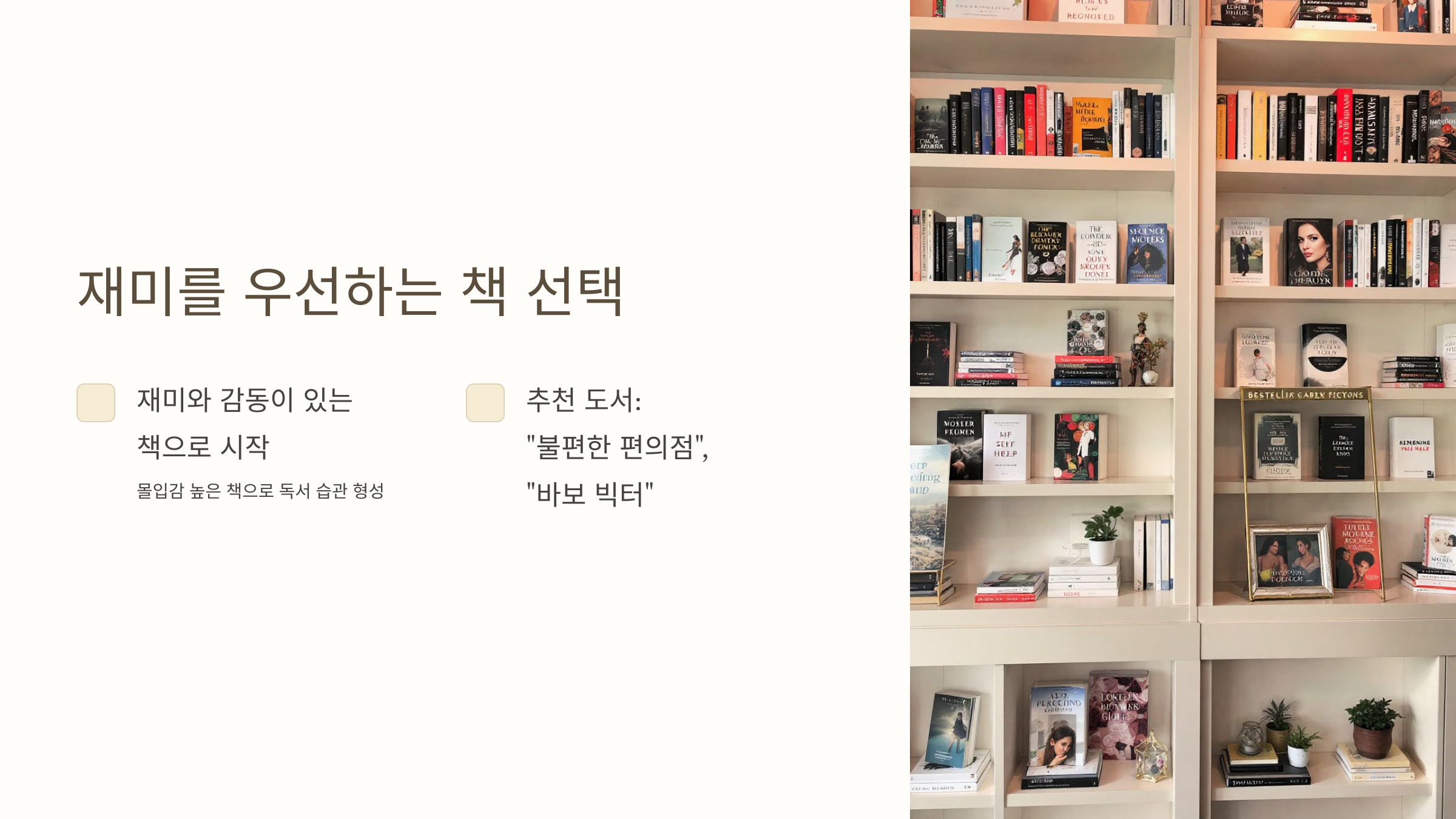 • 소설처럼 읽기 쉬운 책부터 시작해, 점차 실용적인 책으로 전환하세요.