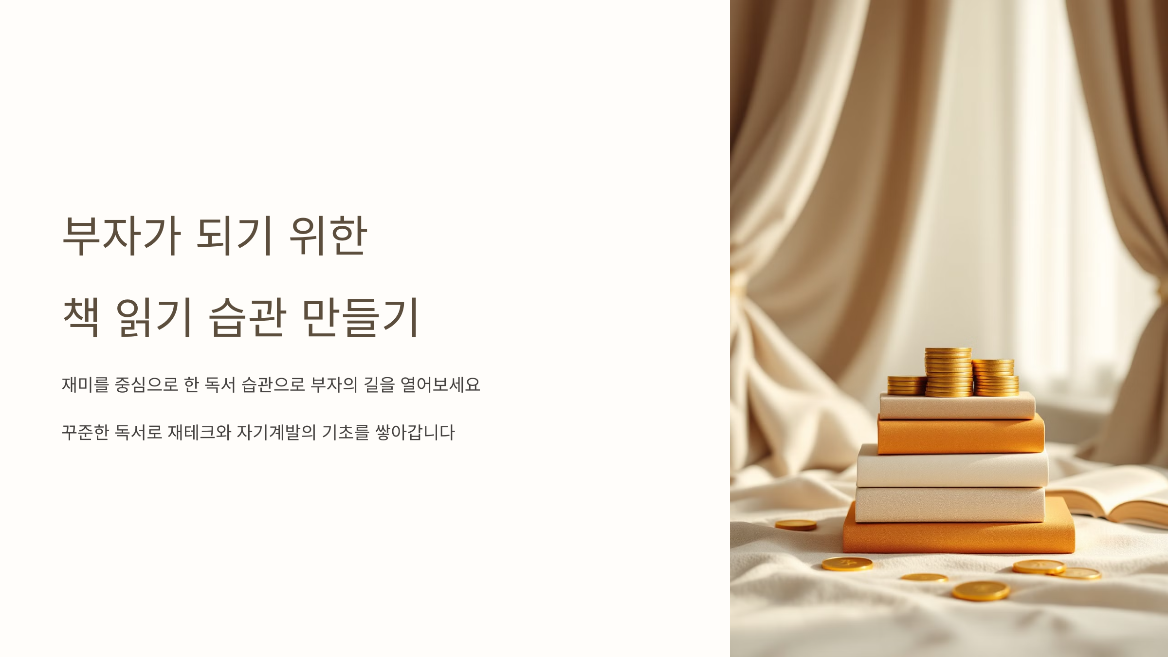 부자가 되기 위한 독서 습관은 재미에서 시작됩니다. 오늘 한 권의 흥미로운 책을 골라, 읽는 즐거움부터 경험해 보세요. 작은 재미가 지속적인 습관을 만들고, 습관은 부자의 사고방식과 행동으로 이어질 것입니다.