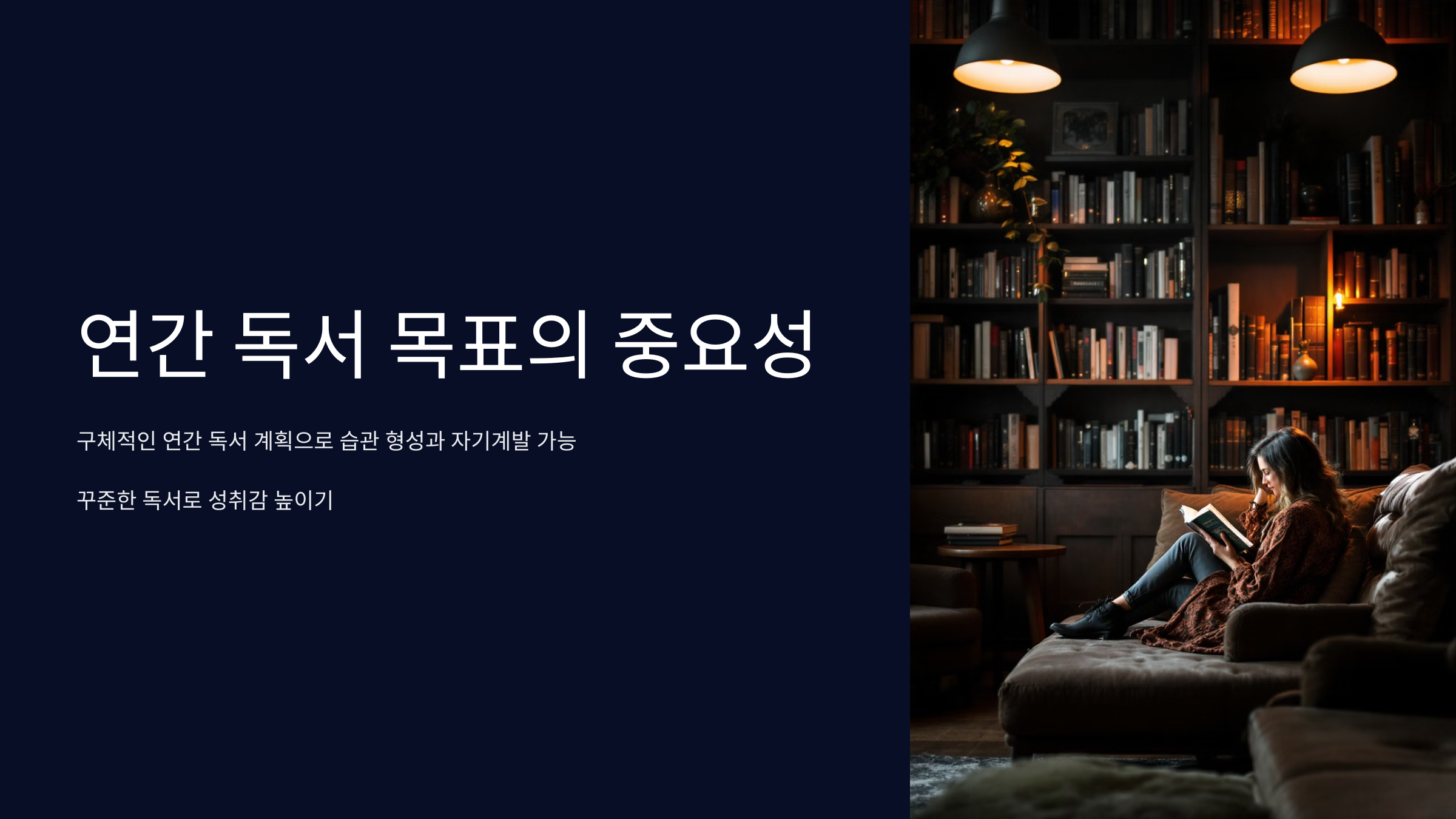 연간 독서 목표를 설정하고 이를 꾸준히 이루어나가는 과정은 자기계발뿐 아니라 삶에 긍정적인 변화를 가져다줍니다. 목표를 세우고 이를 이루기 위해 매일 조금씩 독서를 이어간다면, 연말에는 스스로의 성취에 큰 만족감을 느낄 수 있을 것입니다. 오늘부터라도 한 해 동안 읽고 싶은 책을 정하고, 꾸준히 도전해보세요!