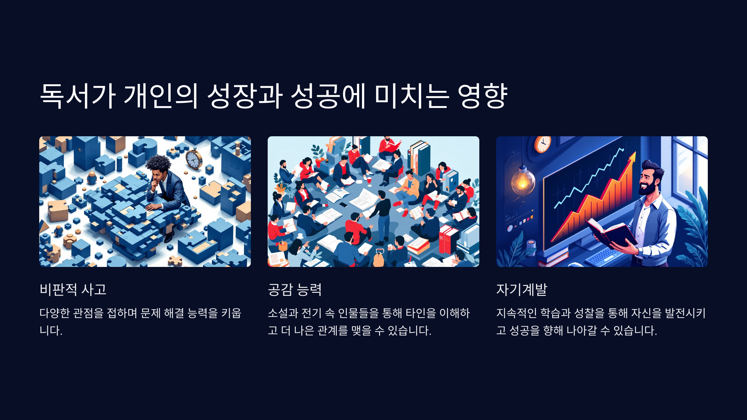 소설이나 전기를 읽으며 다른 사람들의 삶을 이해하는 경험은 공감 능력을 키워줍니다. 이는 대인 관계에서 중요한 자질로 작용하며, 리더로서의 역할을 수행하는 데 도움이 됩니다. - 지속적인 배움을 통한 자기계발