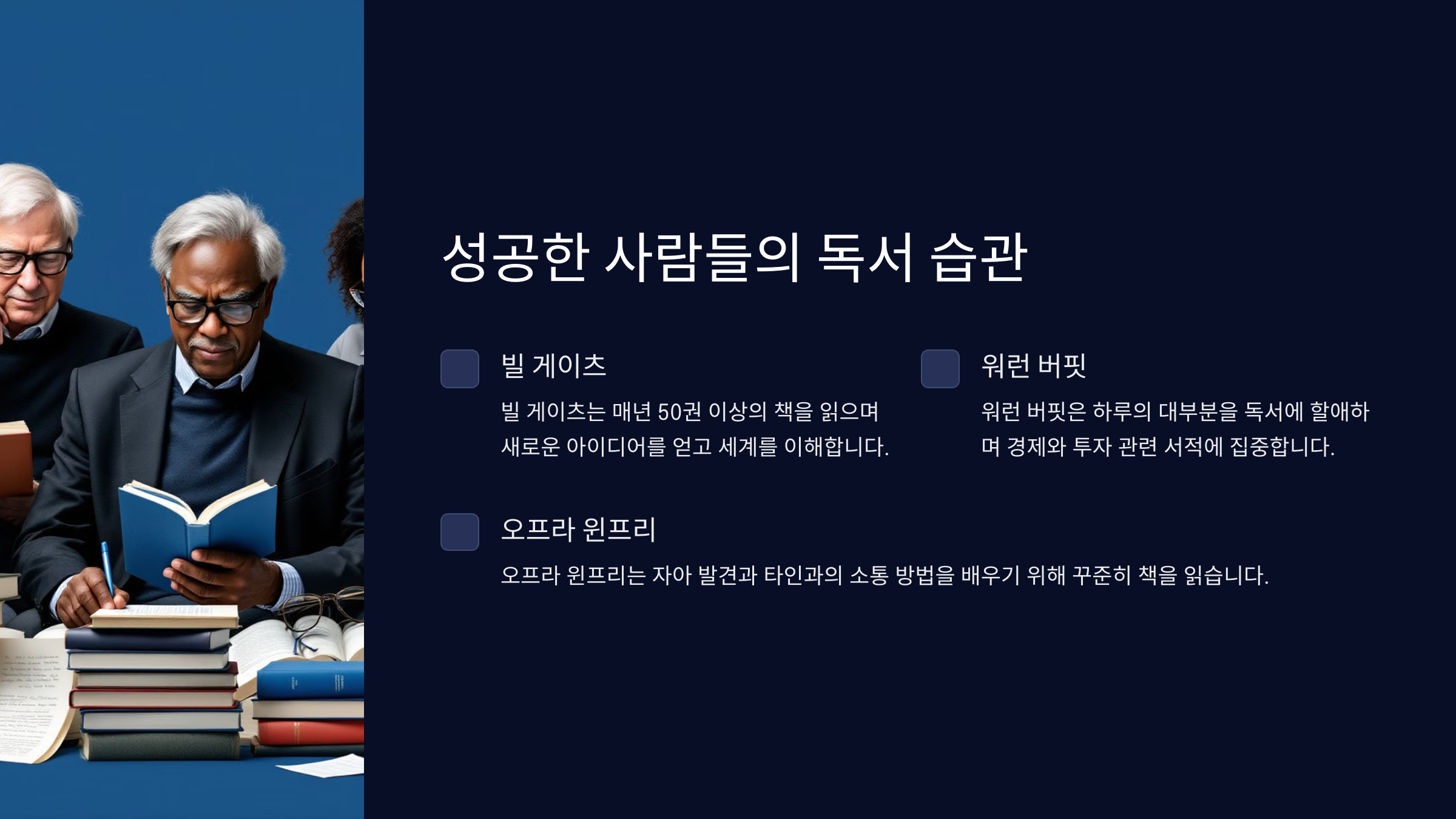 세계적인 투자자 워런 버핏은 하루의 대부분을 독서에 할애하며, 자신의 성공을 독서 덕분이라고 언급한 바 있습니다. 그는 주로 경제와 투자 관련 서적을 통해 깊이 있는 분석력과 판단력을 길렀다고 말합니다. - 오프라 윈프리: 책을 통한 자아 발견
