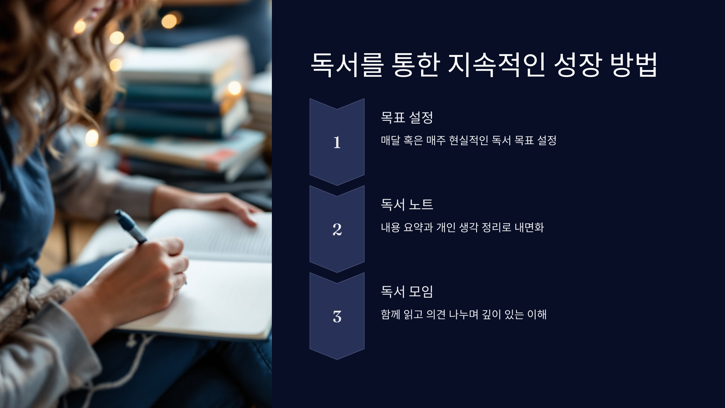 성공한 사람들의 사례에서 보듯이, 독서는 꾸준히 실천할 때 가장 큰 효과를 발휘합니다. 다음은 독서를 통해 지속적으로 성장할 수 있는 방법입니다.