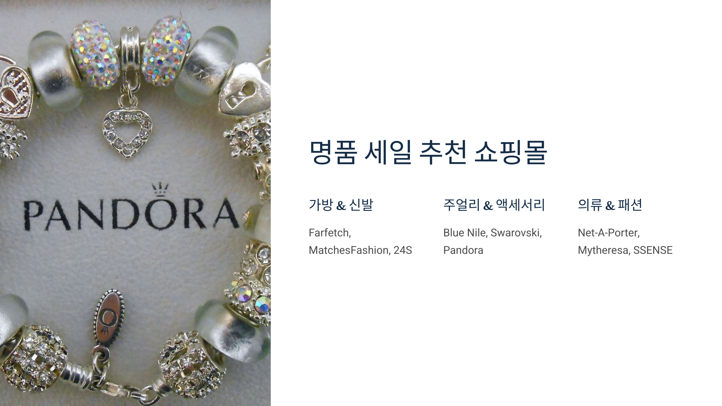 - Pandora (www.pandora.net): 팔찌와 참(charm) 할인.