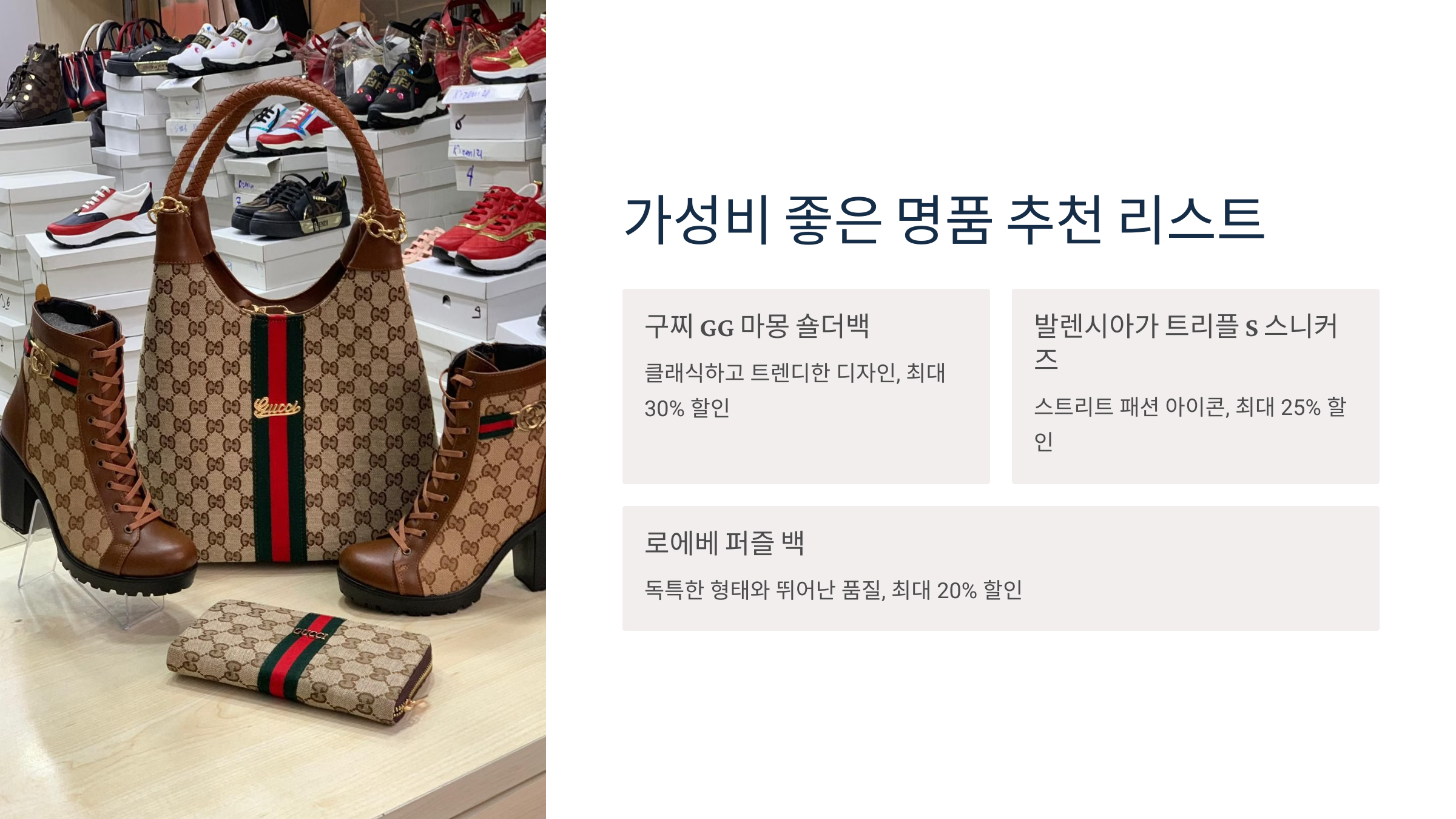 - 명품 브랜드는 일반적으로 20~50% 할인, 일부 상품은 최대 70%까지 할인.