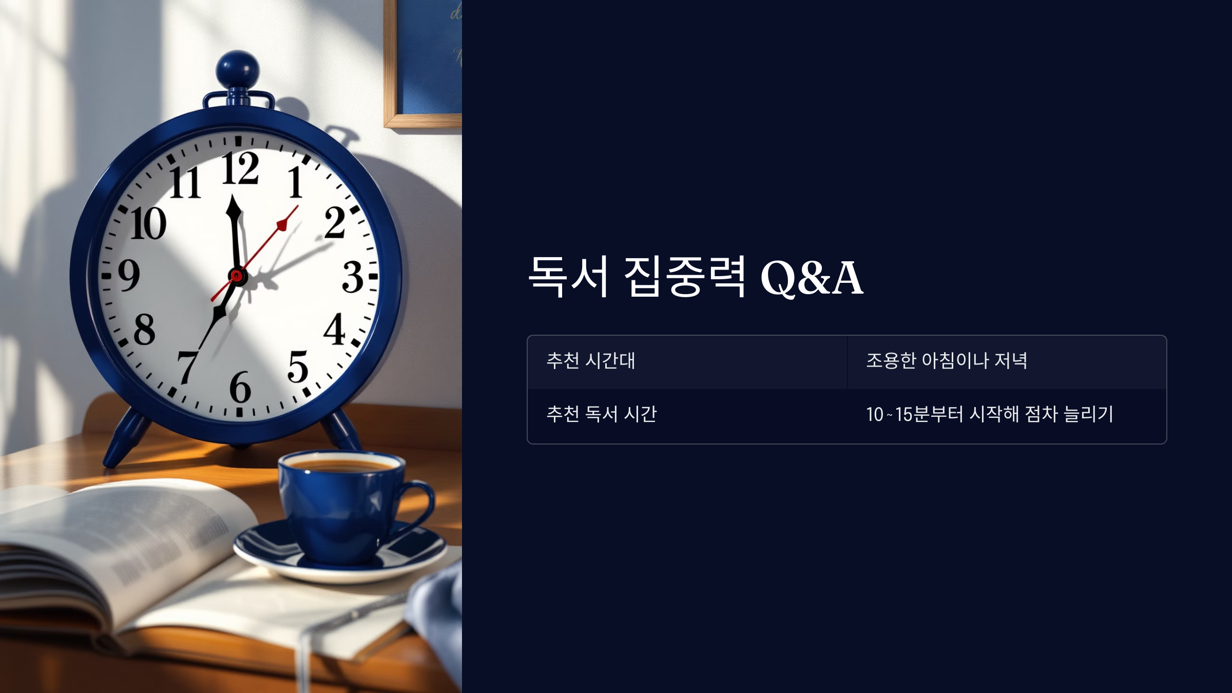 A1. 조용한 아침 시간이나 저녁 시간을 추천합니다. 특히 아침은 뇌가 맑고 집중하기 좋으므로 독서에 효과적입니다.