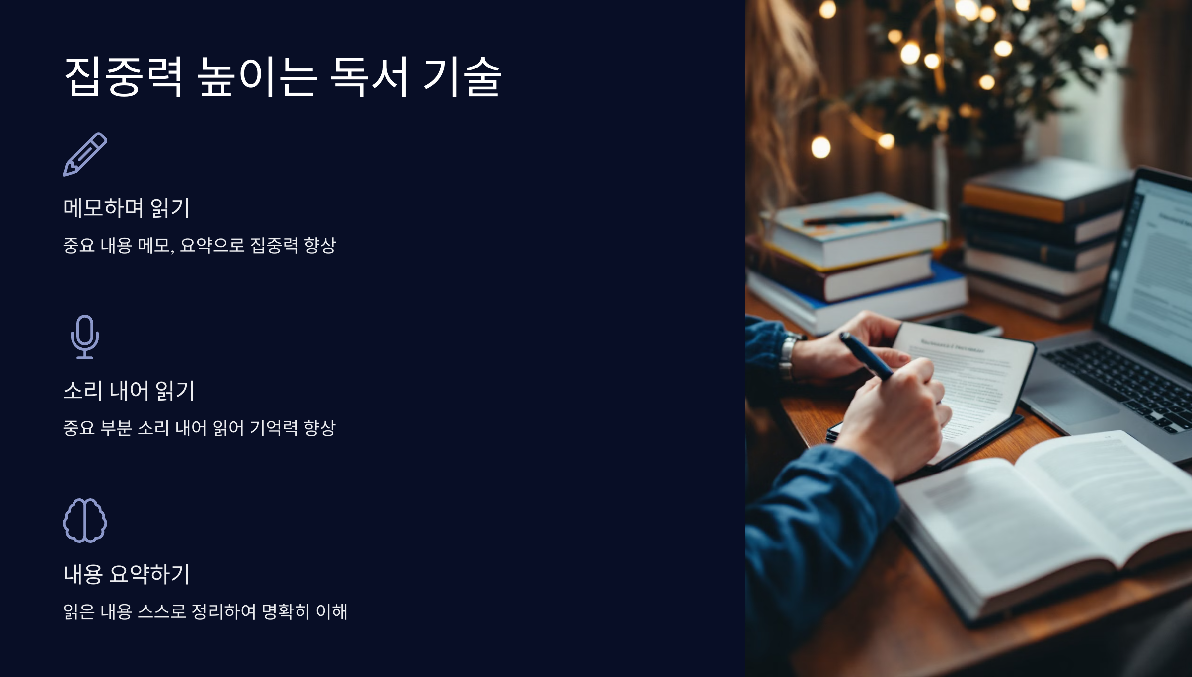 조용한 장소에서라면 소리 내어 읽는 것도 좋은 방법입니다. 특히 중요한 부분을 소리 내어 읽으면 더 쉽게 집중할 수 있으며, 내용을 더 잘 기억할 수 있습니다. - 읽은 내용 스스로 요약하기