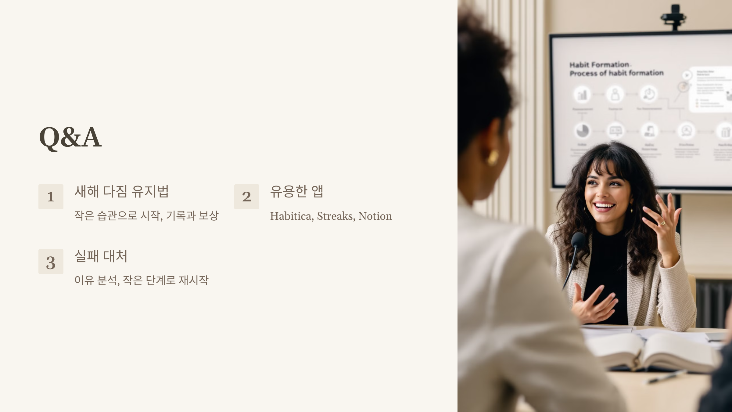 A1. 작은 습관으로 시작해 점진적으로 늘리세요. 성취를 기록하고 스스로에게 보상을 주는 것도 중요합니다.