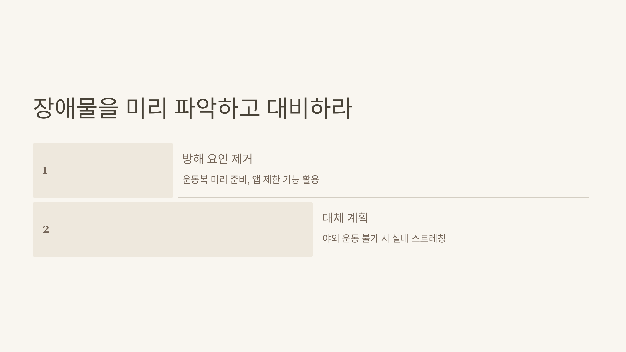 - 예: 비가 와서 야외 운동이 어렵다면 실내 스트레칭으로 대체.