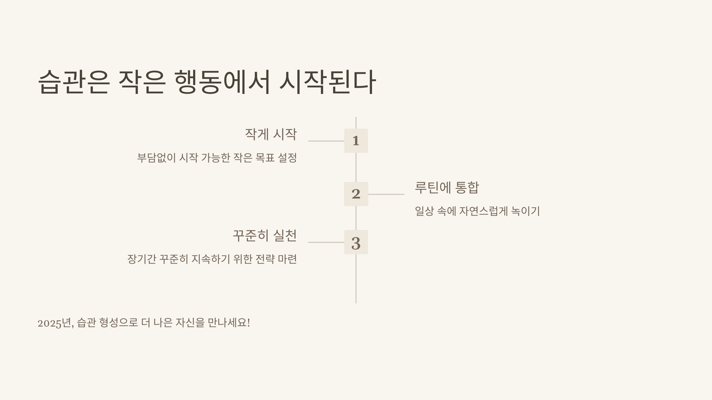 습관은 작지만 강력한 힘을 가지고 있습니다. 새해 다짐을 현실로 바꾸기 위해서는 작게 시작하고, 루틴에 통합하며, 꾸준히 실천하는 것이 핵심입니다. 꾸준함이 곧 성공으로 가는 길입니다. 2025년에는 습관 형성을 통해 더 나은 자신을 만나보세요!
