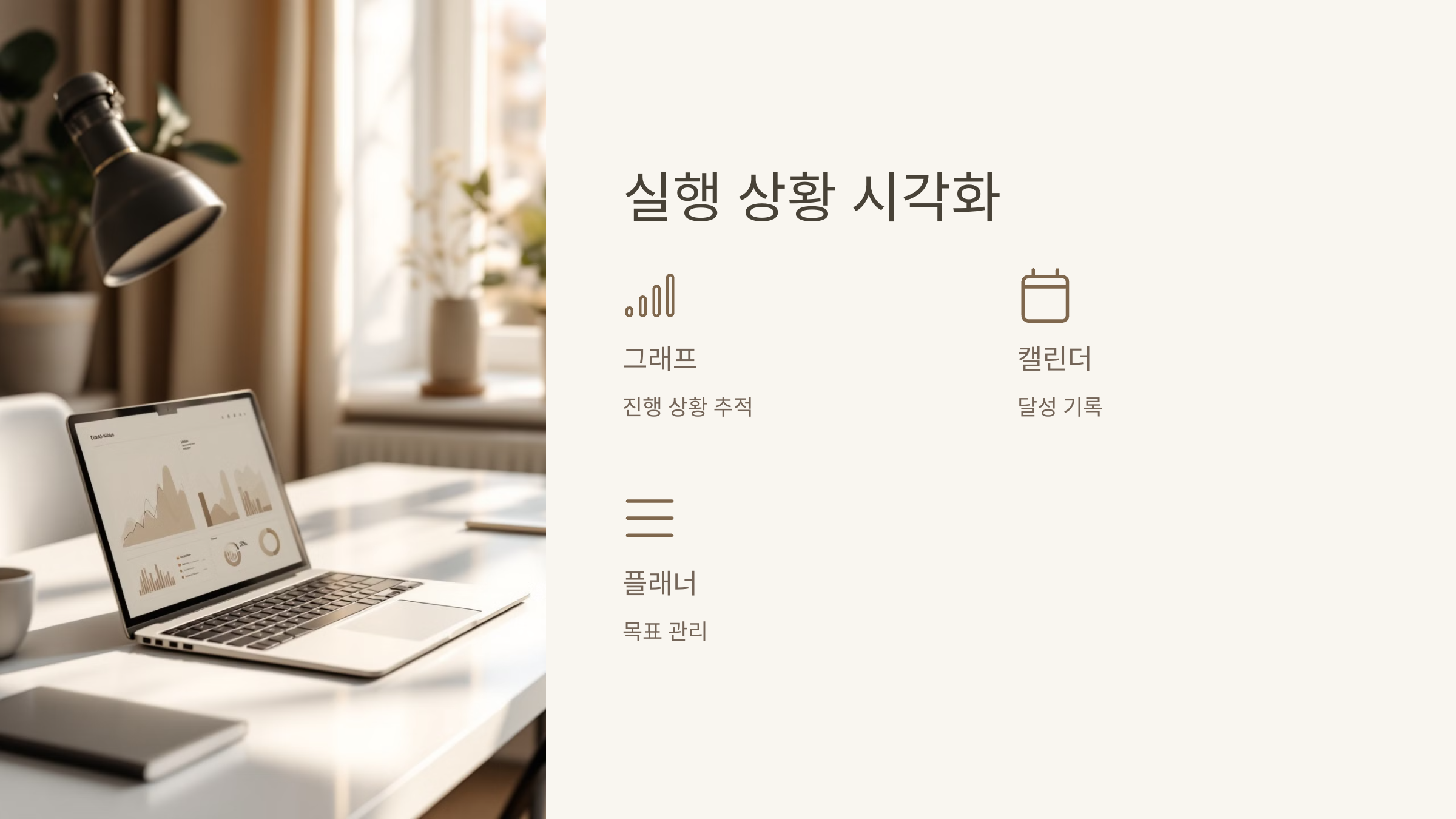 - 플래너, 그래프, 캘린더를 활용해 목표의 달성률을 한눈에 볼 수 있게 표현하세요.